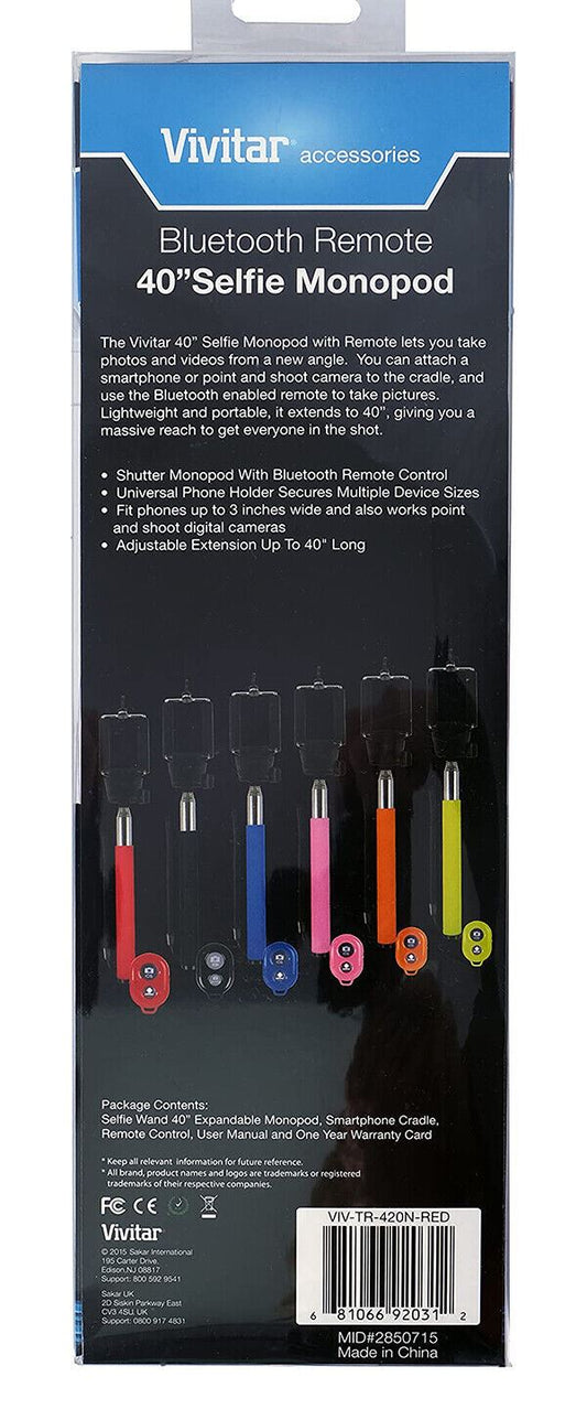 Vivitar 40" 100cm Selfie Stick Monopod in Red + Bluetooth remote + Phone holder