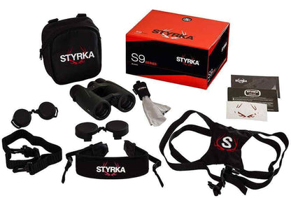 Styrka Strong S9 10 x 42 ED Open Hinge Binoculars + Chest Harness Case KIT Key Features Styrka's flagship optic series, the 10x42 S9-Series ED Binoculars are engineered with complementary technologies to produce and optic that is built to perform well in low-light conditions and in the harshest environments. First is the use of extra low-dispersion (ED) glass in the lens elements to correct chromatic and spherical aberrations. Next are high-density glass SK15 roof prisms that have a high refractive index that limits internal light diffraction to boost contrast and brightness. The prisms are also phase-corrected and dielectric coated, which further limit internal light loss and diffraction, improving image contrast. The optical path is fully multi-coated with their proprietary SXL-MAX anti-reflection coatings which increase light transmission, image contrast and sharpness, and provide true colour rendition. This all translates to an immersive observational experience showing bright and clear high-contrast images with accurate colour across the entire wide field of view - especially at low light such as dawn and dusk, and heavily overcast skies. The chassis is built with an open-bridge/dual-hinge design which offers more gripping surface without sacrificing strength, and helps to reduce the overall weight. Made for a life outdoors, the optical tubes are nitrogen-filled and O-ring sealed to make them not only fog-proof when moving between extreme temperatures, but also waterproof and submersible to 3.3' for up to 30-minutes. The exterior has black textured rubberized Armor that protects against knocks and drops, and offers a slip-resistant grip for sure handling in cold and wet conditions. Styrka includes a one-piece ocular rain-guard and tethered objective lens covers, plus a binoculars' harness that keeps the binoculars close to the body while moving to eliminate snags and swing, and relieve neck strain by redistributing the weight to the shoulders. Optical Performance Use and Handling Construction Details Whats Included? Supplied with Case with strap + a Chest Harness for case + Neoprene neck strap, Objective caps, rain-guard, Spudz Micro Fibre branded cleaning cloth, instructions and Styrka Sticker Specification Prism Type Roof Magnification 10x Objective Lens Diameter 42 mm Angle of View 6.5° (Actual) Field of View 341.2' @ 1000 yd / 113.7 m @ 1000 m Minimum Focus Distance 6.6' / 2 m Exit Pupil Diameter 4.2 mm Eye Relief 16 mm Inter-pupillary Adjustment 58 to 74 mm / 2.3 to 2.9" Diopter Adjustment -3 to +3 Focus Type Centre Fog-proof Yes, Nitrogen Filled Water Resistance Waterproof, IPX7 Dimensions 6 x 5.4 x 2.4" / 15.2 x 13.7 x 6.1 cm Weight 31 oz / 878.9 g Package Weight 4.3 lb Box Dimensions (LxWxH) 13.8 x 8.9 x 5.2"