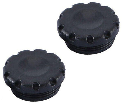 A pair of black plastic screw on covers to fit the 10-pin remote socket on many Nikon DSLRs and film cameras.