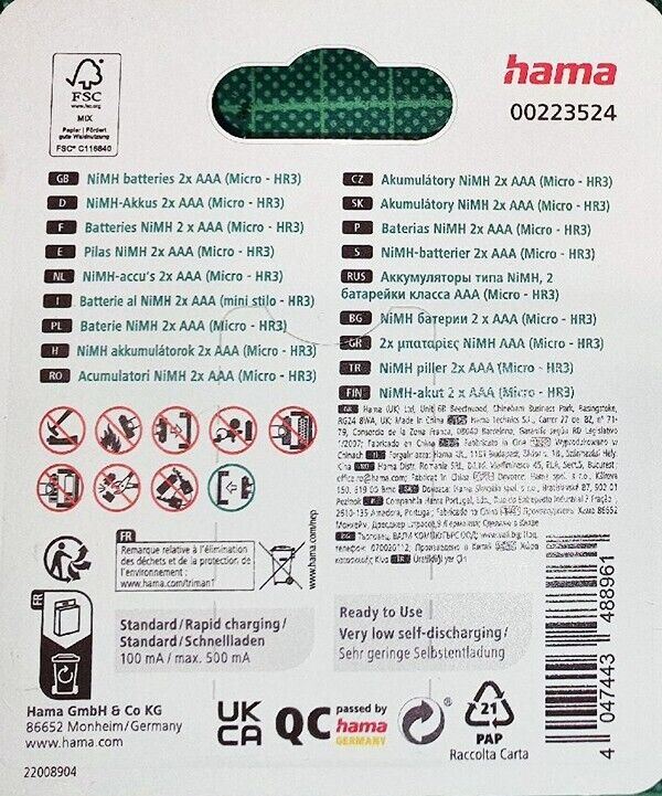 2 x HAMA NiMH Rechargeable Batteries, AAA 1000 mAh Mignon Quick Charge (UK) BNIP