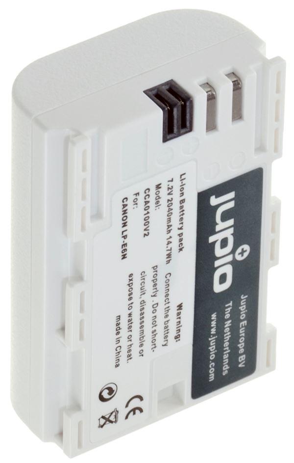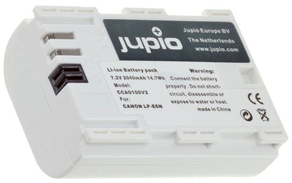 Jupio Two LP-E6N Batteries + USB Dual Charger Value Pack (2040mAh) This compact and convenient LP-E6N Battery & USB Dual Charger Value Pack from Jupio combines two LP-E6N lithium-ion batteries with a USB-powered battery charger, making it possible to recharge the batteries from USB chargers and powerbanks at home or on the road. · Compatible with select Canon products · USB Input: 5V / 2.1A · Charger Output Range: 4.2-8.7V / 500mA · LED Charge Status Indicator Fits Canon 5D IV, 6D II, 7D II, R, XC10 Replaces Canon LP-E6N Jupio LP-E6N is designed as a replacement for Canon LP-E6, LP-E6N and LP-E6NH, although the Canon LP-E6NH is 90mAh higher capacity than this battery, so will work, but is slightly lower capacity and may not offer all the communication features the new LP-E6NH offers Each battery has a 3-year limited warranty, protecting you whatever happens. What’s Included? Specification Chemistry Lithium-Ion Output Voltage 7.4 VDC Package Weight 0.81 lb Box Dimensions (LxWxH) 7.9 x 5.3 x 1.7" Battery Chemistry: Lithium ion , Newer type of rechargeable, giving best performance for a rechargeable. Voltage: 7.4 V Capacity: 2040 mAh Watt hours: 14.7 Wh Weight: 76 g Dimensions: 56 mm x 38 mm x 21 mm