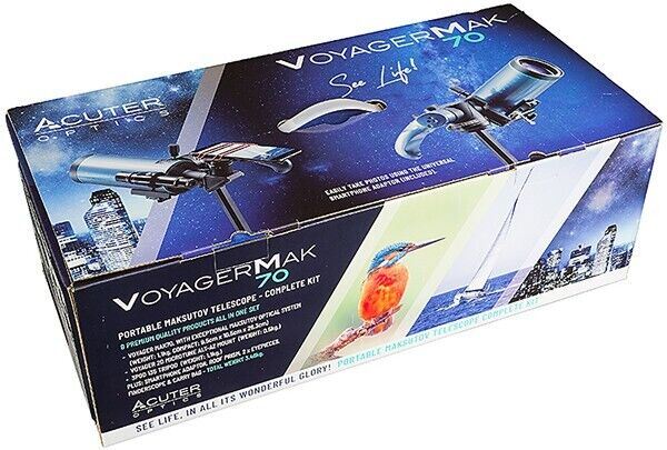 "“Small is beautiful, or so the saying goes, and the Acuter Voyager MAK80 certainly fits the description, even when it’s still in its gift box. The instrument is a compact telescope and it is clearly well-suited for a wide range of activities, from nature and birdwatching to astronomy.... just requires the addition of a tripod, for which there is a 1/4-inch tripod thread included in the Vixen-style mounting bar.... being so light and compact makes it ideal for taking on holiday.... The light carry case is ideal for this system...Perfect for taking on a plane or train as hand luggage.”"