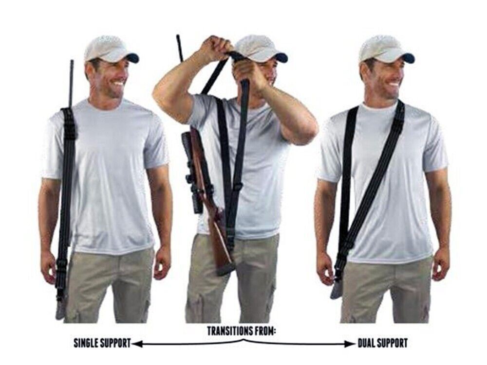 - It is a two-shoulder weapon sling, designed for your comfort by distributing weight upon both shoulders for hands-free stability. You can outlast that deer in the bush!