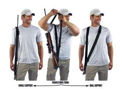 Alpine Innovations Dual Support Sling. The Dual Sling rifle sling is secure, comfortable and can quickly transform from a single shoulder to a dual shoulder rifle sling in seconds. Dual Sling provides superior comfort by distributing weight upon both shoulders for hands-free stability and includes 2 Metal Q.R. swivels compatible with rifles or shotguns. Dual Sling is built with 1.5” webbing that grips your shoulders, therefore, you can trek worry free of slippage.
