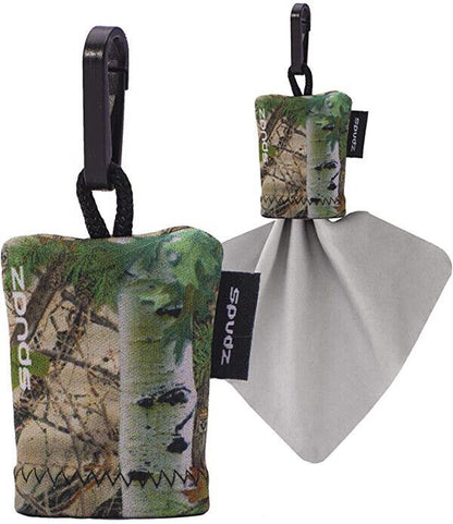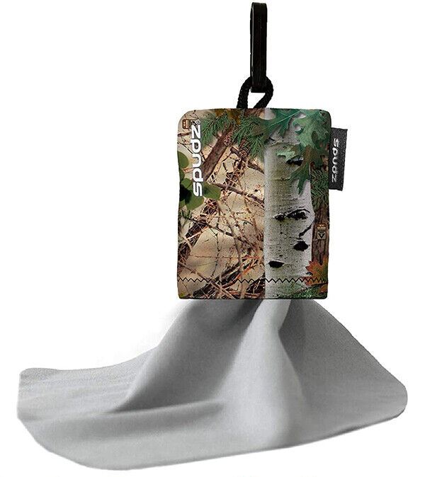 This is a Spudz Microfibre Cleaning Cloth 6" x 6" in plain grey with a Real Tree Camouflage pouch