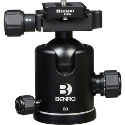 A member in good standing of Benro's new generation of B Series professional ball heads, the B3 Triple Action Ball Head uses magnesium-alloy components for better performance and lighter weight. The B3 has a triple action design featuring panning and locking knobs, and, a long, precise friction adjustment. Also, the head has a graduated panning scale, and an Arca-type QR adapter with a PU-60 QR plate. It can handle weights up to 39.7 lb and only tips the scales at 1.5 lb itself.