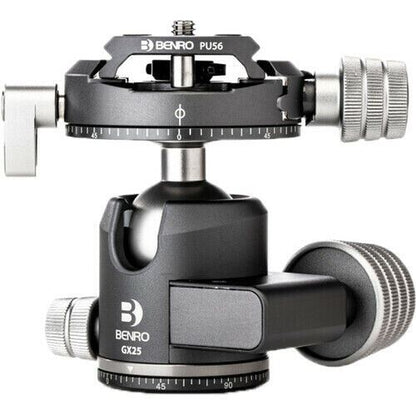 Benro GX25 Two Series Arca-Type Low Profile Aluminum Ball Head A perfect companion for your next shoot, the GX25 Two Series Arca-Type Low Profile Aluminum Ball Head from Benro delivers uncompromising strength, functionality, and value. This head features an intuitive design with a dual panoramic pan head for precise movements, and rounded operation knobs enable you to quickly and securely switch between landscape and portrait orientations. 360° rotation beneath the quick release plate and 360° rotation beneath the ball head provide accurate positioning to get panoramic photos with ease, and reference scales allow your settings to be easily replicated. The included bubble level enables you to accurately level out your shot, and the head features a safety lock with pull and twist functionality for the quick release plate. Aluminum construction with an excellent strength to weight ratio CNC machined quick release plate system for easy mounting Dual panoramic functionality designed for precise movements 360° panning beneath quick release plate 360° panning beneath ball head Easy-to-see reference scales Bubble level for precise leveling of photographs Safety lock for quick release plate 55 lb load capacity What’s Included? Specification Head Type Ball Head Base Mount 3/8"-16 Female Camera Mounting Screw 1/4"-20 Male Quick Release Plate Type Arca-Type Load Capacity 55.12 lb / 25 kg Number of Bubble Levels 1 Friction Control Yes Independent Pan Lock Yes Material Aluminum Panning Range 360° Ball Sphere Diameter 1.18" / 30 mm Base Diameter 1.6" / 40.64 mm Dimensions H: 3.3" / H: 85.0 mm Weight 11.99 oz / 340 g Package Weight 1.08 lb Box Dimensions (LxWxH) 5.8 x 4.6 x 4.5"
