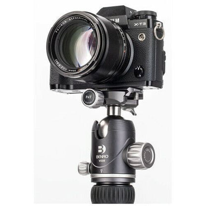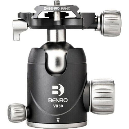 Benro VX30 2 Series Dual Panoramic Arca Type Aluminium Ball Head Featuring an elegant and minimalistic design with an excellent strength to weight ratio, the VX30 Two Series Arca-Type Aluminum Ball Head from Benro offers dual panoramic mode, which allows you to pan the head from its base in addition to the quick release platform. The controls are simple, with ball friction adjustments built into the main locking knob and an independent pan lock. This newly designed ball head features a safety lock for the quick release plate, and the included bubble level enables you to accurately level out your shot. Aluminum ball head with 66 lb load capacity for outstanding strength to weight ratio Dual panoramic mode allows you to pan the head from its base in addition to the quick release platform Ball friction adjustment built into the main locking knob and an independent pan lock 360° pan movement lets you capture panoramic shots with ease Bubble level for accurately leveling photographs Safety lock for quick release plate What’s Included? Specification Head Type Ball Head Base Mount 3/8"-16 Female Camera Mounting Screw 1/4"-20 Male Quick Release Plate Type Arca-Type Load Capacity 66.14 lb / 30 kg Number of Bubble Levels 1 Friction Control Yes Independent Pan Lock Yes Material Aluminum Panning Range 360° Ball Sphere Diameter 1.57" / 40 mm Base Diameter 1.97" / 50 mm Dimensions H: 3.9" / H: 100.0 mm Weigh 13.4 oz / 380 g Package Weight 1.195 lb Box Dimensions (LxWxH) 6.1 x 4.6 x 4.5"