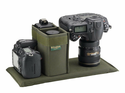 Billingham 335 Mark II Camera / DSLR Bag in Khaki with Tan Trim with Olive Green Lining The 335 MKII is an updated version of our classic 335 bag and sits in the middle of our 5-Series MKII range for size. As such it perfect for carrying 2 DSLR or mirrorless cameras with small to medium lenses attached or 1 camera with a selection of lenses. This camera bag has a total of 10 pockets, including a full length front pocket that can hold a 14” laptop, tablet or accessories. Made in England with 3-layer waterproof fabric and real leather. MULTIPLE LAYOUT OPTIONS INSIDE Included with the bag are several dividers that can be repositioned or removed to provide different options for arranging your equipment. Organisation can be further enhanced with the 20+ different divider sizes/styles available to customise the bag to your equipment and preferred layout: Please note: MAIN COMPARTMENT AND TUKTOP FEATURE Experience comprehensive protection with padding on all four sides and the base of the main compartment, safeguarding your valuable equipment. The front and back walls each have two strips of Velcro® so that you can attach the padded dividers previously mentioned. Behind the padded walls at the front and back is a slim space, made of 2 pockets each (4 in total). Ideal for manuals, lens filters, etc. The zips can also be tucked into this space to keep them out of your way during use. We call this the ‘TukTop’ feature. You can still store slim gear in the space while using the TukTop feature. All the features mentioned here are improvements over some previous versions of the bag adding convenience as well as protection for your equipment. FRONT DUMP POCKETS On the front face of the bag are two generously sized dump pockets. These are perfect for film, cables, batteries, spare memory cards etc - helping you keep your bag organised whilst easing access when you need it most. Adjacent to each dump pocket is a small pen pocket, adding to the 335 MKII's organizational features. The secondary flap shown protects these pockets from dust, weather and unwanted fingers. It closes with its own dedicated leather ‘Quick Release Straps’ – just lift them up-and-off the brass clogball to access the pockets. FULL WIDTH FRONT ZIP POCKET The 335 MKII has a full-length front zip pocket with enough space for a 14” MacBook Pro in a slim case Please note: FULL WIDTH FRONT ZIP POCKET (CONTINUED) Within the previously mentioned full-length zip pocket, you'll find two padded pockets, perfectly suited for small lenses, compact flashes, or lavalier microphones. Please note: Carrying a laptop in the front zip pocket may restrict the capacity of these two padded pockets. ZIPPED REAR POCKET & LUGGAGE TROLLEY STRAP The bag's rear is equipped with a zipped pocket, perfect for securely storing maps, tickets, and other essentials. A new addition to the MKII version is the luggage trolley retainer strap, designed to conveniently slide over the handle of a trolley suitcase, a major convenience during travel. BRASS FEET Each bag in our '5 Series MKII' lineup (225 MKII, 335 MKII, 445 MKII, and 555 MKII) is equipped with durable brass feet, securely mounted on robust leather corner patches. This design not only protects the bag's corners from wear but also extends the overall longevity of the product. While we are discussing the other '5 Series MKII’ bags – they are all identical to each other in design, varying only in size and the number of dividers included. The 225 MKII is the smallest and 555 MKII is the biggest. LEATHER GRAB HANDLE For utmost comfort, the bag features a leather grab handle that wraps around its strong webbing carry straps. Additionally, the bag includes an extra internal webbing strap sewn in at the back under the top flap. Used in conjunction with the front handle, to which the grab handle is attached, this feature enables safe carrying of the bag even when it's open. DELTA SLING AND OPTIONAL DELTA POCKETS The shoulder sling of the 335 MKII is made of strong shuttle-woven polyester with a brass fixing to allow you to adjust the length to suit your height and shooting style. Where the sling attaches to the bag, it splits into an inverted 'Y' shape at each end. This distinctive split design enhances weight distribution, ensuring the bag remains stable and level, even when carrying heavy loads. Further, the lower ends of this split sling act as attachment points where optional Delta Pockets can be clipped on, offering added space and organization as needed. The image provided showcases the back of one such Delta Pocket. QUICK RELEASE STRAPS (AND HOW TO ATTACH A TRIPOD) The Quick Release System to open the top flap has been adapted so that the top grain leather straps pass through solid brass ‘D’ rings at the end of the webbing carry handles. The bag was designed this way to provide fast, secure closure even when the bag is heavily loaded – the strong webbing and brass D-rings carry the weight. At the bottom of the bag (front and back) are fixings for optional Tripod Straps. Additionally, some people just thread tripods through the webbing of the top handle of the bag (what will work for you depends on the design of your tripod). COMPARISON TO ORIGINAL 335 Compared to the most recent version of the 335, the 335 MKII offers several upgrades: Additionally, it retains improvements that were gradually added to the 335 (and its predecessors) over the years such as the SuperFlex divider system, two strips of Velcro on the front and back of the main compartment to more securely attach dividers, a StormBlock butyl rubber lining for improved waterproofing, the 'TukTop' feature to tuck the zips of the main compartment out of the way during use and a significantly more robust 'closed-cell' foam padding. Bonus notes: - The picture is of the SP20 shoulder pad that is included with the bag. FINALLY... Specification & Sizing THE BAG External dimensions W370mm (14½) x D220mm (8⅝") x H265mm (10½") Interna