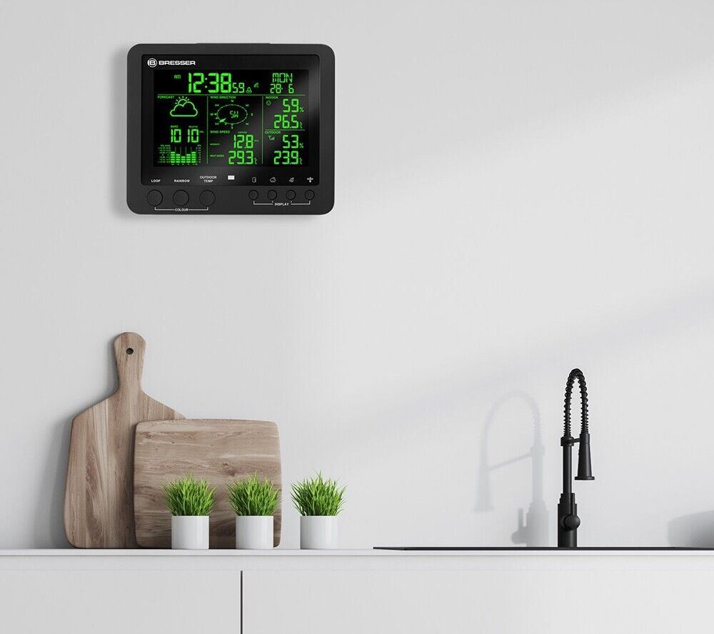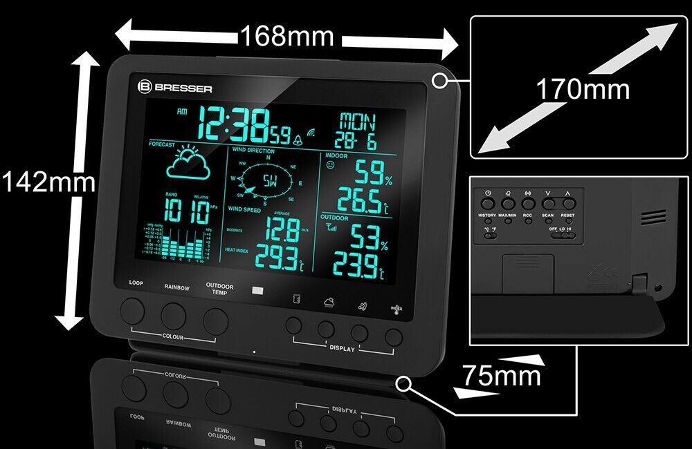 The 5-in-1 outdoor sensor transfers reliably the measured values for wind speed, wind direction, humidity, temperature and precipitation amount to the main station. On the clearly structured display of the main station not only current values but also numerous of historical data can be displayed. This allows for the internal saving and evaluation of the measured values over a period of 24 hours. From the collected data the weather station determines a very reliable local weather trend forecast for the next 12 hours, which is displayed on the screen by 6 graphical symbols. For maximum and minimum values an individual alert can be programmed which gives both an acoustical as well as a light signal when the predetermined value is reached. For outdoor temperatures below -3 °C a specific alert can be activated as frost / ice warning. A bad room climate often carries a health risk particularly for children and the elderly. The BRESSER 5-in-1 Weather Station provides a smart solution. The room climate indicator informs by means of symbols about the room climate. Furthermore the BRESSER Weather Station 5-in-1 disposes of a radio controlled time and date setting (DCF time signal). Just a few minutes after switching on the weather station the current Central European Time and the date with weekday are automatically set. An alarm clock with snooze function are also part of the scope of features. A new feature of this weather station is the colour change of the display when the outdoor temperature changes. So one can easily see from the colour of the display if it's weather for a jacket or a t-shirt.