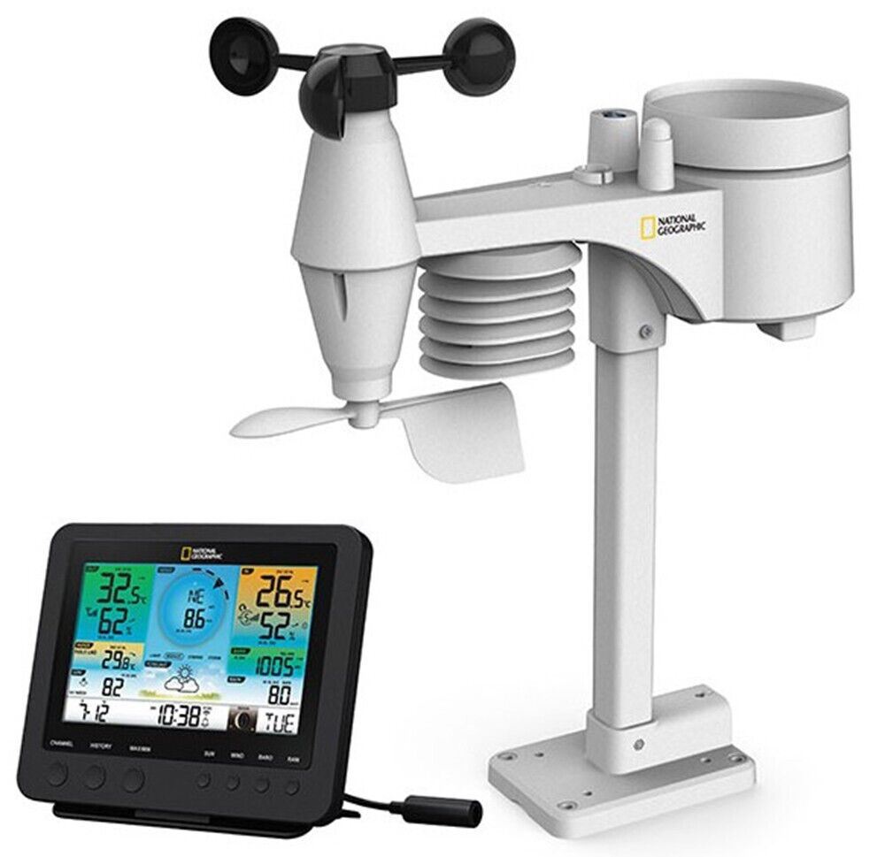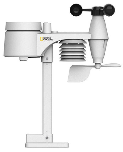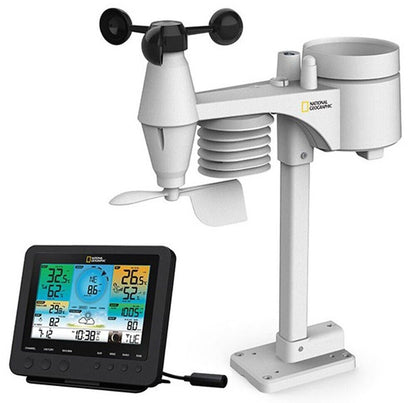 The new NATIONAL GEOGRAPHIC WIFI Colour Weather Station with 7-in-1 professional outdoor sensor offers a comprehensive information service. The multifunctional outdoor sensor can easily be installed using the installation accessories supplied! The sensor reliably transmits measured values for wind speed, wind direction, humidity, temperature, amount of precipitation, as well as UV level and light intensity to the base station via 868 MHz frequency. The console's clearly structured 5.7" colour display shows a large variety of measured local data as well as your station's historically measured values.
