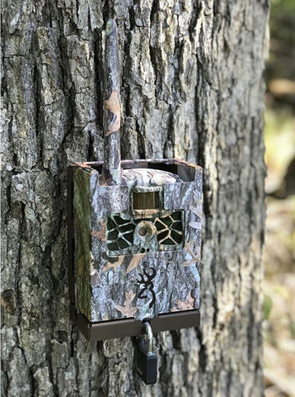 Browning Trail Camera Security Box for Strike Force/Dark Ops/Command Ops #BTC-SB Protect your Strike Force, Dark Ops, or Command Ops Pro camera while it's left unattended in the field for days, weeks, or months with the Browning Trail Camera Security Box. Made of durable and strong steel, it attaches to a tree and virtually disappears thanks to its woodland camouflage exterior so it won't attract undue attention from game or passersby. With your camera installed in the box, you can lock it using a standard padlock of your choice. To make sure it doesn't get stolen, the box has mounting holes on the back plate so it can be screwed or bolted in place or use the holes on the side to temporarily secure it to a tree trunk using a cable-type lock like a Master Lock Python. What’s Included? Specification Package Weight 1.72 lb Box Dimensions (LxWxH) 8.95 x 7.7 x 3.5"