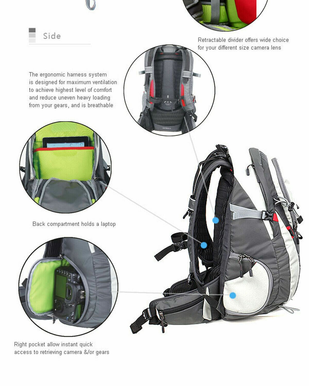 Right side pocket allows quick and easy access to camera gear. Meaning less time spent locating equipment within the bag