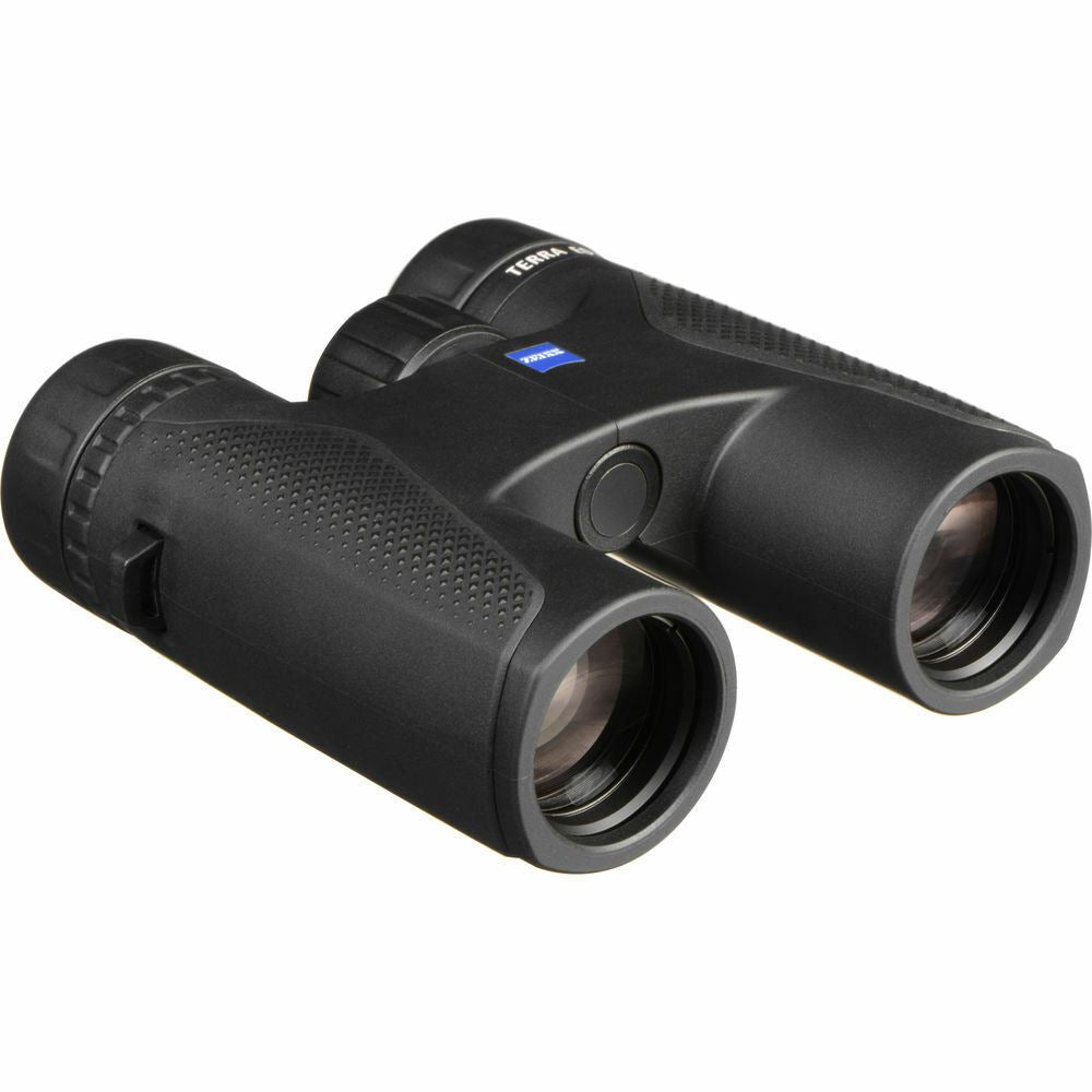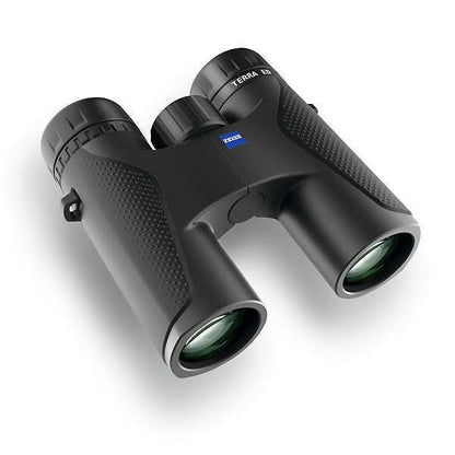 Carl Zeiss Terra ED 8 x 32 Black/Black The black 2017 edition of Zeiss Optics' 8x32 Terra ED Binocular features a redesigned ergonomic chassis that makes holding them more comfortable, especially during long glassing sessions. Optically, they retain the exceptional elements that are the hallmarks of the Terra ED including compact Schmidt-Pechan roof prisms, SCHOTT extra low-dispersion (ED) glass, and the proprietary multi-coatings. These complementary technologies and elements work together to produce an immersive observational experience that presents clear and bright views, despite the relatively small objectives, with accurate color representation and virtually zero distortion across the entire wide field of view. The comfortable ergonomic chassis is made of a fiberglass reinforced polycarbonate to help reduce weight, without sacrificing strength while adding impact and temperature resistance. Being resistant to temperature changes not only ensures that the housing will remain a constant temperature, even in cold and wet conditions, but will not experience the expansion and contraction common in metal chassis that can cause the optical elements to move out of alignment over time and preventing the binocular's ability to achieve sharp focus. The chassis is covered in a black rubber armoring that helps to protect it from drops and impacts, and provides a slip-resistant grip. Optical Performance 8x magnification 32mm objective lenses Roof prism optical path The compact Schmidt-Pechan prism design corrects the view while allowing for thinner optical tubes versus the more common Abbe-Koenig design SCHOTT ED glass elements reduces chromatic and spherical aberrations to produce views with true color rendition without halos, diffraction, or distortion across the entire field of view Zeiss proprietary hydrophobic multi-coated optics sheds dust, dirt, and oils while improving light transmission, color rendition, sharpness, and contrast Short 5.25 foot close focus distance Wide 61° apparent angle of view 442-foot field of view at 1000 yards Long 16.5mm eye relief Comfortable 4mm exit pupil Use and Handling Closed-bridge configuration Large fast-focus center wheel ±3 right-eye dioptric correction 56-74mm inter-pupillary adjustment range Twist-up click-stop rubber eyecups for comfortable use with or without eyewear Construction Details Impact, corrosion and temperature-resistant fiberglass-reinforce polycarbonate housing Temperature resistance prevents expansion and contraction in extreme temperature changes which prevents optical components from moving out of alignment Protective black rubber armor Nitrogen-filled for water and fog-proof performance Submersible to 100 mbar of pressure, or approximately 3' (1m) Operating Temperature 5 to 140°F (-15 to 60°C) Weight: 18 oz Specifications Prism Type Roof Magnification 8x Objective Lens Diameter 32mm Angle of View 7.6° (actual) 61.0° (apparent) Field-of-View 442.0' @ 1000 yd / 146.7 m @ 1000 m Minimum Focus Distance 5.25' / 1.60 m Exit Pupil Diameter 4.0 mm Eye Relief 16.5 mm Inter-pupillary Adjustment 56.0 - 74.0 mm / 2.2 - 2.9" Dioptric Correction ±3 Focus Type Center Tripod Mount None Dimensions 4.9 x 4.6" / 12.45 x 11.68 cm Weight 18.0 oz / 510 g