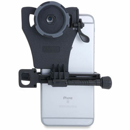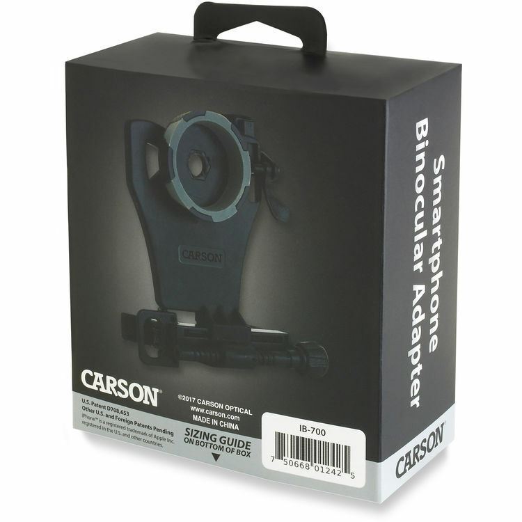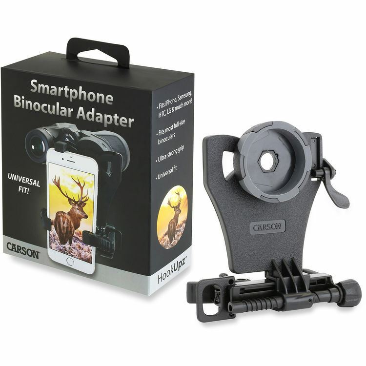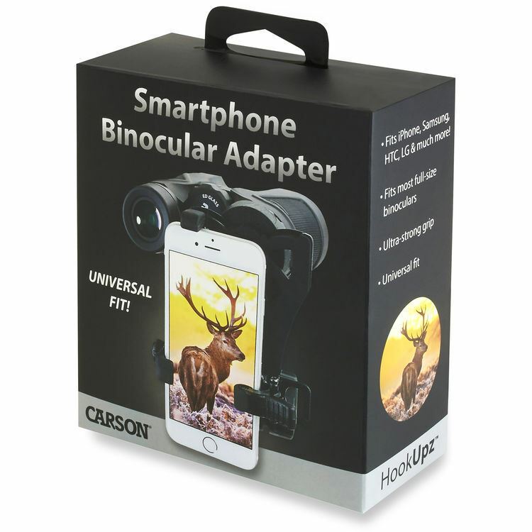 Key Features The magnifying power and premium optical elements in binoculars can make a great telephoto lens for digi-scoping, and the HookUpz Universal Binocular Smartphone Adapter from Carson Optics offers a practical way to connect a smartphone camera to the eyepiece on one of a binocular's ocular tubes. Slip your phone into the holder, press the ring over the eyepiece (it doesn't matter which one – take your pick), and you're ready to capture images and video and share them via email, messaging or social media. Two adapter rings allow the adapter to fit onto most binocular eyepieces with an outside diameter from 40-44mm (1.57-1.73"). The adapter's innovative clamping mechanism holds the smartphone securely, with the camera centered on the binocular eyepiece. In most cases, you will be able to keep your case on the phone when installed in the adapter, and the clamp holds the phone securely in position without marking or marring the screen or case. What’s Included? Specification Dimensions 4.0 x 1.9 x 4.4" (10.2 x 4.8 x 11.2 cm) Weight 2.9 oz (82 g) Package Weight 0.3 lb Box Dimensions (LxWxH) 5.5 x 4.2 x 2.1"