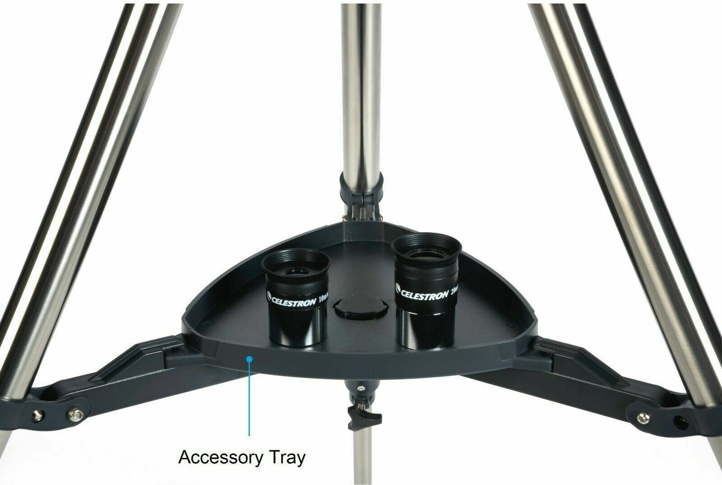 The telescope is equipped with fully coated glass optics for clear and sharp images. Pan handle Alt-azimuth control with clutch offers smooth and accurate pointing and dispenses intuitive tracking and alignment of the scope. Rugged and pre-assembled tripod with 1" steel tube legs provides a rigid and stable platform for detailed and long session observations. "The Sky" Level 1 planetarium software with 10,000 object database and enhanced images is also included.