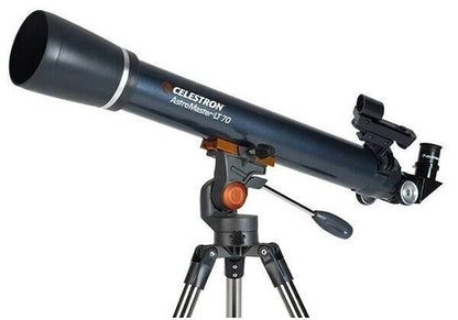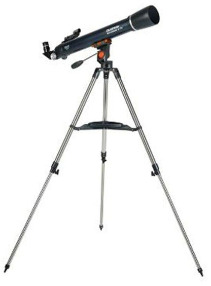 - 70mm refractor telescope with fully coated glass optics and a lightweight frame.