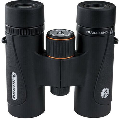 Celestron ED 10 x 32 TrailSeeker WP Roof Prism Binoculars #71403 Key Features Designed as your go-to multipurpose outdoor optic, the Celestron 10x32 TrailSeeker ED Binoculars features a suite of technologies and design features that will make it an essential part of your kit whether you're hunting, birding, hiking, or sightseeing. Broadband anti-reflection fully multicoated high-performance extra-low dispersion glass deliver crisp, true-color images of breathtaking landscapes, vistas, or cityscapes. Phase-corrected and dielectric-coated BAK4 roof prisms maximize light transmission through the prism system, limiting internal diffraction and interference and improving image resolution and contrast. The 32mm objectives keep the overall form factor small so you can easily carry the binocular all day on the trail, in the field, or when sightseeing around the world. Combining all these optical features produce crisp and sharp high-contrast, wide-angle views with accurate color across the entire visible spectrum with limited distortion, especially at the edges. Complementing its optical performance is a lightweight magnesium housing that is nitrogen filled and O-ring sealed to make it waterproof and resistant to internal fogging when you move through extreme changes in temperature or environmental conditions. The body features an ergonomic design with rubber armor and strategically placed texture that offers a secure hold and a pleasant handling experience, with the large center focusing knob providing smooth adjustments. To help you with focusing and correcting for dioptric differences, the focus knob and the diopter ring are knurled and can be easily adjusted even when wearing gloves. Ideal for fast glassing on the go, the Trailseeker ED comes with tethered caps that won't get lost when you're out and about and a shoulder harness that eliminates strain on your neck and prevents it from swaying and swinging if you need to climb over rough and rocky terrain. Optical Performance Use and Handling Construction Details What’s Included ? Specification Prism Type Roof (BAK4) Magnification 10x Objective Lens Diameter 32 mm Angle of View 6.2° (Actual) Field of View 326' @ 1000 yd / 108.23 m @ 1000 m Minimum Focus Distance 8.2' / 2.5 m Exit Pupil Diameter 3.2 mm Eye Relief 14.4 mm Interpupillary Adjustment 56 to 73 mm / 2.2 to 2.9" Diopter Adjustment -3 to +3 Focus Type Center Fogproof Yes, Nitrogen Filled Water Resistance Waterproof, IPX7 Dimensions 4.84 x 4.8 x 1.89" / 12.3 x 12.2 x 4.8 cm Weight 17.6 oz / 499 g Package Weight 2.21 lb Box Dimensions (LxWxH) 9.2 x 8 x 3.5"