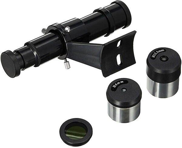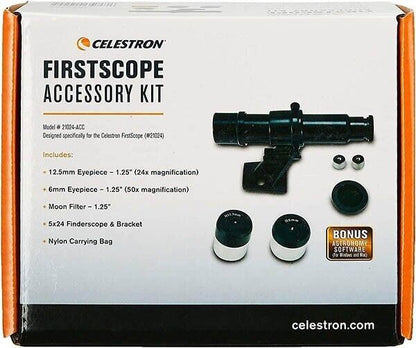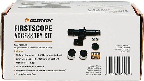 Designed with the goal of improving the observational experience of their FirstScope, Celestron assembled the FirstScope Accessory Kit. It includes a 5x24 finderscope with mounting bracket, two eyepieces, a moon filter, and a carrying bag for the kit plus the telescope and mount. Although assembled for the FirstScope, the eyepieces will fit any 1.25" focuser or accessory and the filter will screw onto most 1.25" astronomical eyepieces.