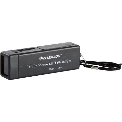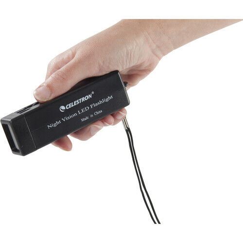 Celestron Flashlight Night Vision RED LED Astronomy Torch #93588 Key Features Celestron's Night Vision Flashlight is a purpose-built astronomy illumination tool, that uses two red LEDs to preserve night-adjusted vision while providing light to set up, read/write notes, change eyepieces, or navigate. Its combined rotary variable brightness control/on-off switch allows you to adjust the brightness over a wide range up to 25 lumens. At the maximum brightness setting, the emitted light is bright enough to locate dropped items or disassemble your telescope after observing. The medium brightness levels will properly illuminate a star chart without affecting your pupil's darkness-adapted dilation. At the lowest brightness setting, there's just enough light to determine a filter designation or an eyepiece's focal length. The Night Vision Flashlight is powered by a single 9-volt battery that lasts for up to 12 hours on high and as much as 300 hours on low The supplied 20" (51 cm) cord allows you to hang the light around your neck when not in use. What’s Included ? Specification Illumination Source 2 x Red LEDs Maximum Output 25 lumens Battery / Runtime 1 x 9V battery / Low: 300 hr, High: 12 hr, maximum Construction Material Plastic Dimensions 4.25 x 1.3 x 1.0" (10.8 x 3.3 x 2.5 cm) Weight 3.5 oz (99.2 g), with battery Package Weight 0.29 lb Box Dimensions (LxWxH) 5.6 x 2.5 x 2.5"