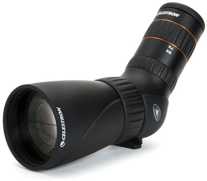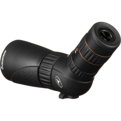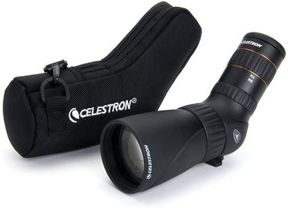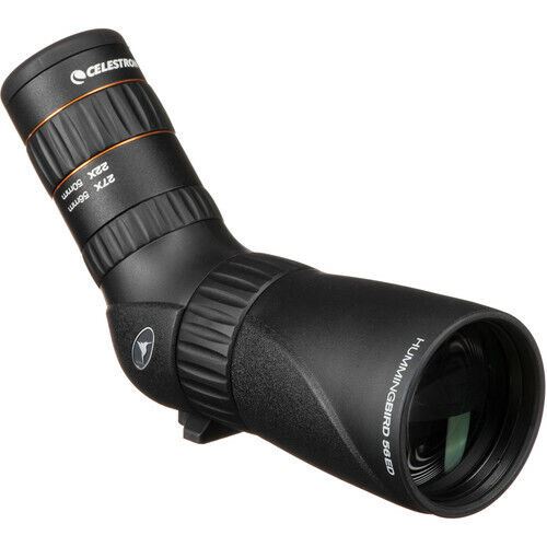Enhance your trips, vacations, and outdoor adventures with the ultra-compact and ergonomic Hummingbird 9-27x56 ED Spotting Scope from Celestron. It can easily fit in the pocket of your coat and will not take much space in your backpack, travel bag, or glove compartment. This optic features all the characteristics of the high-performing spotting scopes and has exemplary extra-low dispersion (ED) glass to deliver crisp, vivid, and true-color images of breathtaking landscapes, vistas, or cityscapes. With the fully multi-coated optics, you will get excellent visual transparency of the optical glass, high resolution, and high-contrast of images. The 56mm objective will make the most of the available light and perform well in most lighting conditions, from early morning until night, and even allow you to use this spotting scope for stargazing. For good close-ups as well as distant observations, the scopes features 9-27x zoom magnification range and 9.8' minimum focusing distance. Optical Performance Use and Handling Construction Details What’s Included? Specification Viewing Angle Angled Magnification 9 to 27x Objective Lens Diameter 56 mm Angle of View 9x: 4.22° (Actual) Minimum Focus Distance 9.8' / 3.0 m Exit Pupil Diameter 9x: 6.2 mm Eye Relief 15.0 mm Fogproof Yes, Nitrogen Filled Water Resistance Waterproof Tripod Mounting Thread 1/4"-20 Dimensions L: 8.4 x H: 5.1 x W: 2.4" / L: 21.3 x H: 13.0 x W: 6.1 cm Weight 20.8 oz / 590.0 g Package Weight 2.3 lb Box Dimensions (LxWxH) 10 x 6.8 x 4.5"