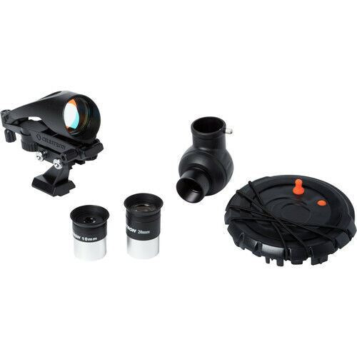 Celestron Inspire 80AZ 80mm f/11 Alt-AZ Refractor Telescope #22402 Ideal for beginners or as a simple grab-and-go option for intermediates, the Inspire 80AZ 80mm f/11.3 Refractor Telescope from Celestron has the longest focal length, and thus the highest magnification potential, in the Inspire series, and is intended to give users a complete rig that is easy to set up and use for making detailed observations of the Moon; and viewing the planets, meteor showers, and brighter deep-sky objects. Its unique asymmetrical manual alt-azimuth mount helps to reduce overall weight without sacrificing stability, and a control cable makes finding and tracking objects easier while reducing vibrations. Two eyepieces produce 45x and 90x magnifications, and a 90° erect-image prism not only puts the eyepieces in comfortable viewing position but corrects the view to allow this astronomical scope to be used as a terrestrial spotting scope. To take photos or videos through the scope, simply remove the innovatively-designed front lens cap. The 20mm eyepiece fits into the back to mount into the drawtube or diagonal, and a series of adjustable bungee cords holds a smartphone securely in place. An adjustable-height stainless steel tripod provides a stable platform for observing, and the included accessory tray is designed for convenience by folding with tripod so it always stays on and ready. Integrated into the bottom of the mount is a red flashlight that illuminates the accessory tray from the top. This allows you to change eyepieces and filters, or to mount your phone on the lens cap, without affecting your night-adjusted vision and to work with both hands - an important advantage when handling delicate optical gear. Performance Mount and Tripod Mount: Tripod: Included Accessories Eyepieces: Diagonal: Digiscoping Adapter: StarPointer Pro Finderscope: Red LED Flashlight: What’s Included? Specification Optical Design Refractor Aperture 80 mm / 3.2" Focal Length 900 mm Focal Ratio f/11.3 Eyepiece Barrel Diameter 1.25" Diagonal 90° Erecting Finderscope Yes Type Manual; Alt-Azimuth Material of Tripod Stainless Steel Wi-Fi No Package Weight 21.5 lb Box Dimensions (LxWxH) 38.5 x 17 x 10" FREE Fedex Priority 24 & 48 Delivery to Zone 1 Areas