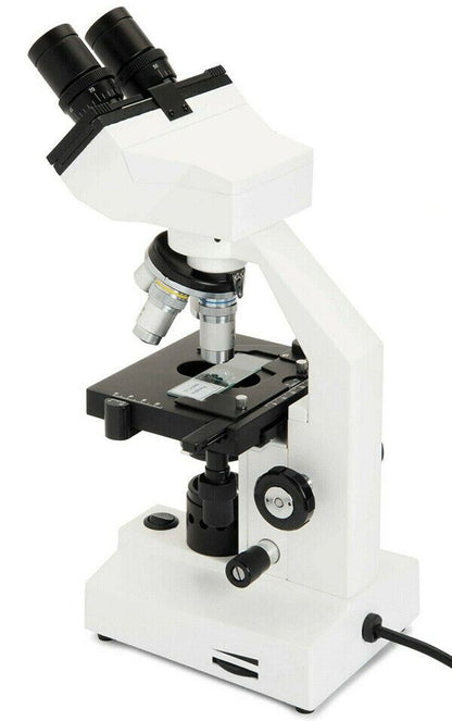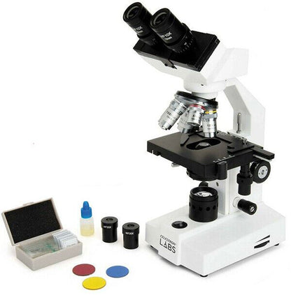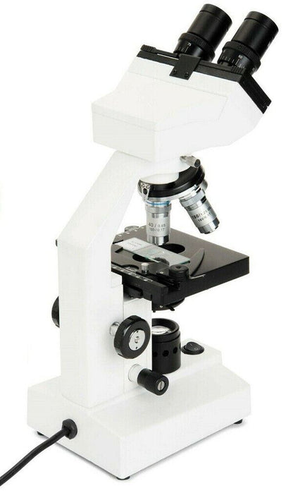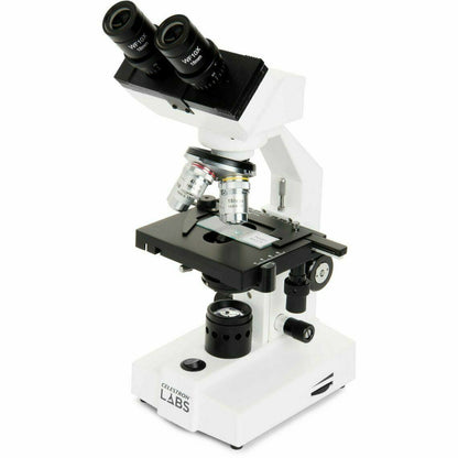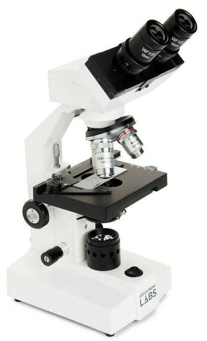The Celestron Compound Microscope offers all the advanced features at an economical price. With 10x and 20x eyepieces and 4 included objective lenses (4x, 10x, 40x and 100x), a magnification ranging from 40x to 2000x can be achieved. 10x eye piece is loaded with pointer. The objective lenses are fully achromatic and provides real colors of the specimen under observation. The binocular head is fully adjustable that can rotate at 180 degree and at 45 degree inclination for comfort viewing. Strong and stable all-metal construction, this microscope features a fully adjustable, mechanical stage so that specimen slides can easily centered. Improve the quality of magnified images with the included 3 colored filters. Built-in, adjustable halogen lower illumination with Abbe condenser and iris diaphragm. The 10 included prepared slides guarantee exciting discoveries right out of the box. The N 1.25 Abbe condenser with iris diaphragm concentrates and focuses the lower illumination for enhanced viewing making the CB2000CF an excellent tool for labs, schools, scientific research and more.