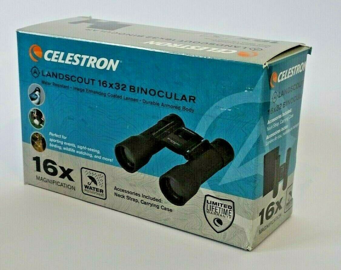 Celestron Land Scout 16 x 32 Roof Prism Compact Binocular #72354 LandScout binoculars are great, all-purpose binoculars at an affordable price that can bring a new level of enjoyment to almost any activity: sporting events, sightseeing, birding and wildlife observation, hiking, and more! Coatings and Prisms Inside the LandScout are two roof prisms, each paired with an auxiliary prism. Roof prisms make binoculars more compact by creating a straight line between the eyepiece and objective lens, lending the design its signature sleek and trim exterior shape. Our roof prisms are constructed of K9 optical glass, which provide high reflectivity so that more light passes through the optical path to your eye. LandScout also contains other optical surfaces treated with special coatings to boost light transmission even more. The result is a brighter view than uncoated binoculars. The Body Whether you’re out on the trail or inside a crowded stadium, you want a binocular that is comfortable to hold and use over long periods, without fear of bumps or drops. LandScout features a lightweight and durable armor-protected chassis. Its tough, rigid frame is coated with rubber to stand up to hard use in the field. The LandScout is also water resistant and can repeatedly stand up to unexpected conditions. Viewing through LandScout is comfortable for eyeglass wearers and non-eyeglass wearers alike, thanks to its rubber eyecups. Keep the eyecups up for proper positioning of the eyes without glasses. If you’re wearing glasses, simply fold them down and out of the way. Perfect for a Variety of Uses LandScout features 16x magnification, the perfect boost in power for sporting events, sightseeing, birding, wildlife watching, and more! You’ll get great views of distant subjects, plus a wide field of view so you can easily follow them as they move. But this 16x32 binocular also offers a close focus of just 26.2 feet so you can also get detailed views of subjects in close range. No matter how you choose to observe, this versatile binocular is an excellent all-around performer. What’s Included? LandScout includes a built-in neck strap for easy carrying. The binocular also includes a protective soft case for storage and transport so you can take it anywhere with confidence. Specification Magnification: 16x Objective Lens Diameter: 32mm (1.26") Angular Field of View: 3.5° Linear Field of View (@1000yds / @1000m): 185ft (62m) Exit Pupil: 2mm (.08") Eye Relief: 10mm (.39") Close Focus: 26ft (8m) Interpupillary Distance (max): 72mm (2.83") Interpupillary Distance (min): 58mm (2.28") Diopter Adjustment Range: ±2 Twilight Factor: 22.63 Relative Brightness: 4 Lens Coatings: Coated Prism Glass (Type): K9 Prism Coating: N/A Weight: 13 oz (369g) Environmental Protection: Water Resistant Nitrogen Filled: No Tripod Adaptable: No Carrying Case: Soft Sided Cloth Dimensions: 91mm x 56mm x 142mm (3.6" x 2.2" x 5.6") Included Accessories: Carrying case| Lens cloth| Instruction manual SOLAR WARNING