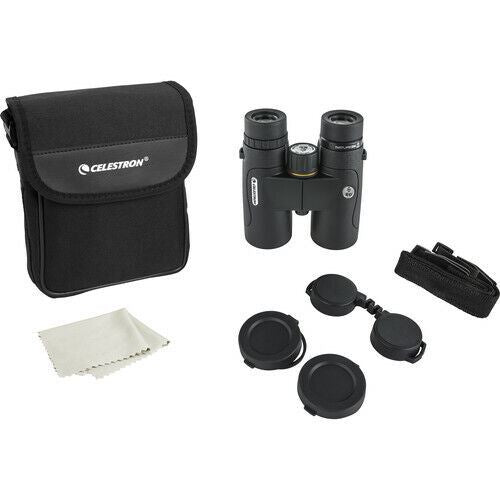 Celestron Nature DX ED 10 x 42 Binocular #723323 Key Features To address the particular demands of hunters, birders, and outdoor enthusiasts—especially when glassing at a long distance—Celestron upgraded their venerable series of binoculars with extra-low-dispersion glass in the 10x42 Nature DX ED Binoculars. They deliver bright high-contrast images with accurate true-to-life color and crisp clarity, even when observing from long distances. To achieve this optical performance, these binoculars feature anti-reflection fully multi-coated extra-low-dispersion (ED) glass lenses with phase-corrected BAK4 roof prisms. The apparent angle of view approaches wide angle, not only to present an immersive observational experience to complement the impressive performance, but also because it helps minimize the appearance of the distracting hand shake that is common when holding high-power optics. Designed to stand up to a lifetime of outdoor use, the binoculars' chassis is made of a lightweight and durable polycarbonate that is also corrosion resistant, making them ideal for boaters. The optical tubes are nitrogen filled and O-ring sealed to make them waterproof and resistant to internal fogging when moving through extreme changes in temperature or environmental conditions. Celestron binoculars include tethered front and rear lens caps to add an additional layer of protection in the field, with the ability to quickly react to glassing opportunities without fear of losing the caps. For those long days in your blind, in the field, or if you just want to eliminate arm fatigue or hand shake, the Nature DX ED can be tripod mounted using an optional adapter. Optical Performance Use and Handling Construction Details What’s Included? Specification Prism Type Roof (BAK4) Magnification 10x Objective Lens Diameter 42 mm Angle of View 5.9° (Actual) Field of View 309' @ 1000 yd / 102.59 m @ 1000 m Minimum Focus Distance 6.5' / 2 m Exit Pupil Diameter 4.2 mm Eye Relief 14.3 mm Inter-pupillary Adjustment 56 to 74 mm / 2.2 to 2.9" Diopter Adjustment -3 to +3 Focus Type Center Fog-proof Yes, Nitrogen Filled Water Resistance Waterproof Dimensions 5.59 x 5.04 x 2.2" / 14.2 x 12.8 x 5.6 cm Weight 24.87 oz / 705 g Package Weight 2.165 lb Box Dimensions (LxWxH) 7.3 x 6.5 x 3.2"