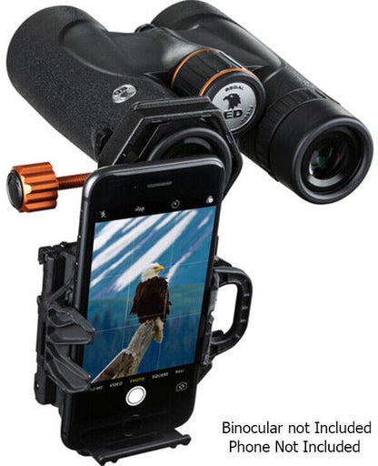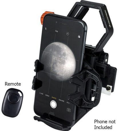Capture still images and videos of celestial and terrestrial objects with virtually any smartphone through almost any eyepiece with Celestron's NexGo 2-Axis Universal Smartphone Digiscoping Adapter—without ever touching your screen. Included with the kit is a remote shutter release that can be used on virtually any iOS or Android smartphone and, if you have an older phone, you can use the included booster for phones shorter than 5" in length.