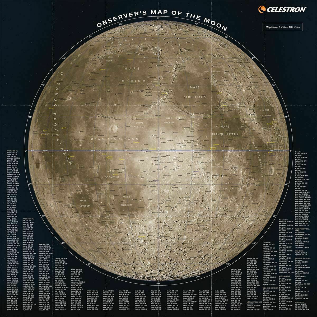 Celestron Observers map of the Moon #93704 The Celestron Observer's Map of the Moon gives you all the lunar surface's highlights and key features, like craters and maria, with a convenient directory you can use to explore with your telescope or binoculas. Lunar topography was done by lunar cartographer Ralph Aeschliman. It is made of sturdy 4.2 mil thick HopSyn synthetic paper, which makes it waterproof and tear resistant. It is 24 x 24" when open and folds down to just 8 x 4" to make it easy to pack and carry.