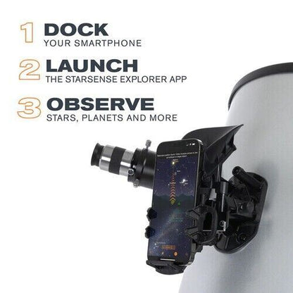 - No need for computerised mounts, planetarium apps, and star charts—simply place your phone in the dock and launch the StarSense Explorer app. After a quick alignment, the StarSense Explorer generates a list of celestial objects currently visible. Make your selection and arrows appear on-screen, guiding you as you move the telescope.