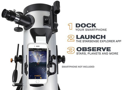 With the Celestron StarSense Explorer LT 127 AZ 127mm f/7.87 Reflector Telescope, exploring the wonders of the universe is as simple as 1-2-3: Celestron are innovators and they have reinvented the manual telescope with their new StarSense Explorer range — the first telescope that uses your smartphone to analyse the night sky and calculate its position in real time. StarSense Explorer is ideal for beginners thanks to the app’s user-friendly interface and detailed tutorials. It’s like having your own personal tour guide of the night sky. Leave complicated star charts, imprecise planetarium apps, and computerised mounts behind. With StarSense Explorer, locating objects has never been easier, faster, or more accurate. Within minutes of setting up the telescope, you’ll be navigating the sky with confidence. Simply place your phone in the unique StarSense dock and launch the StarSense Explorer app. After aligning your phone to the telescope’s optics (a quick, 2-minute procedure), StarSense Explorer generates a list of celestial objects currently visible. Make your selection and arrows appear onscreen, guiding you as you to move the telescope. When the object is ready to view, the bullseye turns green. StarSense Explorer works with most modern smartphones, including iPhone 6 and up and most devices running Android 7.1.2 or later manufactured since 2016. For a complete compatibility list, see the compatibility tab. StarSense Explorer uses patent-pending technology and your smartphone to determine exactly where the telescope is pointed in the night sky. Celestron are innovators and they have reinvented the manual telescope with their new StarSense Explorer range — the first telescope that uses your smartphone to analyse the night sky and calculate its position in real time. StarSense Explorer is ideal for beginners thanks to the app’s user-friendly interface and detailed tutorials. It’s like having your own personal tour guide of the night sky. Leave complicated star charts, imprecise planetarium apps, and computerised mounts behind. With StarSense Explorer, locating objects has never been easier, faster, or more accurate. Within minutes of setting up the telescope, you’ll be navigating the sky with confidence. Simply place your phone in the unique StarSense dock and launch the StarSense Explorer app. After aligning your phone to the telescope’s optics (a quick, 2-minute procedure), StarSense Explorer generates a list of celestial objects currently visible. Make your selection and arrows appear onscreen, guiding you as you to move the telescope. When the object is ready to view, the bullseye turns green. StarSense Explorer works with most modern smartphones, including iPhone 6 and up and most devices running Android 7.1.2 or later manufactured since 2016. For a complete compatibility list, see the compatibility tab. StarSense Explorer uses patent-pending technology and your smartphone to determine exactly where the telescope is pointed in the night sky. A Lost in Space Algorithm (LISA), like the ones satellites use in orbit to correctly reorient themselves, helps the app match star patterns it detects overhead to its internal database. While other astronomy apps may claim that they can help you find objects, they rely exclusively on the phone’s gyros and accelerometers, which aren’t as accurate as LISA technology. No other app can accurately tell you when your target is visible in the eyepiece. StarSense Explorer LT’s simple altazimuth mount makes it easy to move the telescope to find your target. A slow-motion altitude adjustment knob helps you fine tune the telescope’s pointing position and follow targets as they appear to drift across the night sky. It’s all anchored by an adjustable, full-height tripod. With a large 127mm (5”) mirror, this telescope has enough light gathering ability to bring out detail in celestial objects. You can expect sharp, bright views of Jupiter’s four Galilean moons, its cloud bands and Great Red Spot, the rings of Saturn, the trapezium in the Orion Nebula, and beautiful Pleaides Open Star Cluster. Even if you live in a light polluted city location, StarSense Explorer is advanced enough to be able to pick out Jupiter, Saturn, Venus, the Orion Nebula, double stars, and a few more of the most famous celestial objects. However, if you can take the telescope to an even slightly darker location, more objects will become visible. With this 5” Newtonian and relatively dark skies, the Andromeda Galaxy, Hercules Open Star Cluster, and so many more are easily within your reach. A Lost in Space Algorithm (LISA), like the ones satellites use in orbit to correctly reorient themselves, helps the app match star patterns it detects overhead to its internal database. While other astronomy apps may claim that they can help you find objects, they rely exclusively on the phone’s gyros and accelerometers, which aren’t as accurate as LISA technology. No other app can accurately tell you when your target is visible in the eyepiece. StarSense Explorer LT’s simple altazimuth mount makes it easy to move the telescope to find your target. A slow-motion altitude adjustment knob helps you fine tune the telescope’s pointing position and follow targets as they appear to drift across the night sky. It’s all anchored by an adjustable, full-height tripod. With a large 127mm (5”) mirror, this telescope has enough light gathering ability to bring out detail in celestial objects. You can expect sharp, bright views of Jupiter’s four Galilean moons, its cloud bands and Great Red Spot, the rings of Saturn, the trapezium in the Orion Nebula, and beautiful Pleaides Open Star Cluster. Even if you live in a light polluted city location, StarSense Explorer is advanced enough to be able to pick out Jupiter, Saturn, Venus, the Orion Nebula, double stars, and a few more of the most famous celestial objects. However, if you can take the telescope to an even slightly