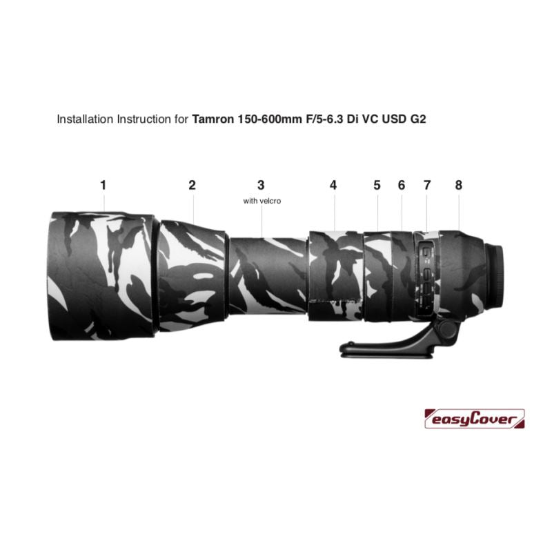 This cover is for the Tamron 150-600mm f/5-6.3 VC USD G2 lens and comprises of 9 individual pieces. One of the pieces features a clear plastic window, which allows a clear view of the switches.