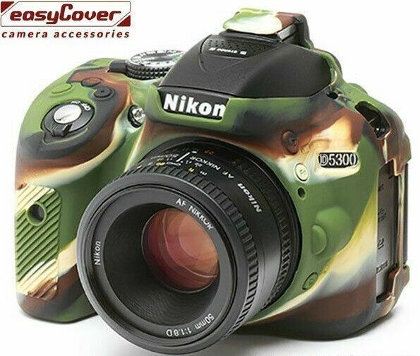 EasyCover camera case for Nikon D5300 in Camouflage Brand New UK Stock, in original packaging with full Guarantee As most important and most-used implement of every photographer, the camera needs to withstand highest impacts day-to-day. Environmental impacts such as humidity and dust as well as unavoidable scratches and pushes can lead to unattractive signs of wear. A Protection Cover for the camera can prevent such damages. Like a second skin, the easyCover fits over your camera and protects it simply and reliably. The silicone cover can be put over easily over your Canon camera. All operating functions of your camera can be found 1:1 on the Cover, so that the full functionality is guaranteed without restrictions. Certainly, the access to memory card and battery compartment is also given. Additionally, the anti-skid grip surfaces on the most important parts provide compact grip and secure stability. As to protect your camera display as well, two self-adhesive foils are also included in delivery. While your camera enjoys highest protection, you can pay attention to the really important things: Impressing pictures! This easy to fit custom made silicone case is moulded specifically for each camera. It provides excellent protection without compromising the ability to access the controls. Main Features: