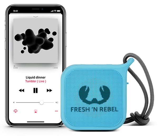 Fresh 'n Rebel "Rockbox Pebble" Bluetooth® Speaker in Sky Blue Music On The Go Specification Colour Blue Line Rockbox Pebble Product Division Mobile Phone Shade of colour Sky Blue Charging Time in Hours 3 h Power Supply Integrated Battery Uptime 5 h Audio Playback Audio-in (3.5 mm jack plug) Connection 3.5 mm Jack Socket, Bluetooth, Micro USB Socket Weight 140 g Voltage 5 V IP protection class IPX4 (Protection against drizzle) Warranty 2 years legal warranty only