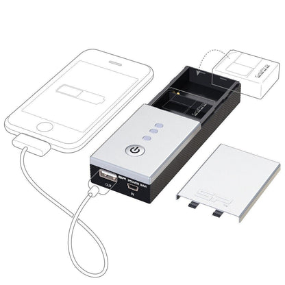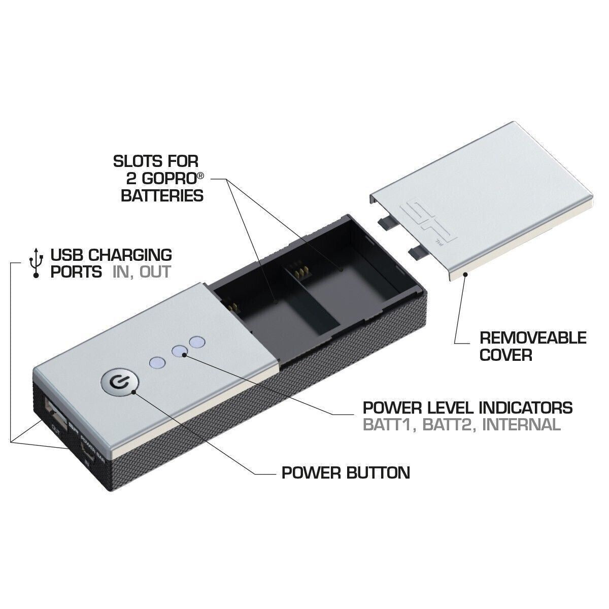 SP-Gadgets Power Bar Duo GoPro HERO Charging Station Silver #53040 The SP-Gadgets Power Bar Duo GoPro HERO Charging Station is a mobile charger that can hold two HERO3 / HERO3+ batteries and features a 12Wh internal battery for use in the field. When working from AC power you can charge up to three HERO batteries at once. Two in the charger and one in the camera via USB. When AC current is not available the internal battery has enough juice to fully charge two HERO batteries. The internal battery takes about four hours to charge fully. The Power Bar Duo will change any GoPro batteries first before recharging itself. On the road the internal battery in the Power Bar Duo can also serve as a backup power source for smartphones, tablets, and other devices that feature USB charging.