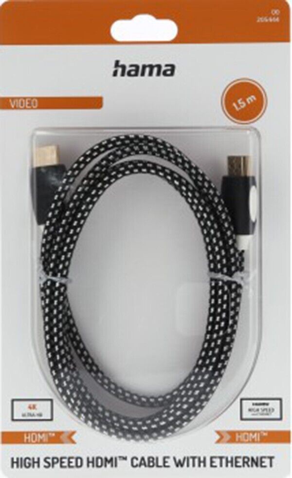 Hama 1.5m HDMI to HDMI Fabric Cable #205444 High Quality Gold Plated Specification Colour Black Productline Action Shade of colour Black Quality Action Bandwidth 600 MHz Connection HDMI™ Plug Data Transfer Rate 18 Gbit/s Max. Resolution 4k (4096 x 2160) Technology Audio Return Channel (ARC)/ HDMI™ Ethernet Channel (HEC)/ HDR Type of Shielding Fully Shielded Additional Functions 3D Transmission, HDTV-suitable Special Feature Gold-Plated/Textile cable Version High Speed with Ethernet Length 1.5 m What's in the Box Warranty 2 years legal warranty only