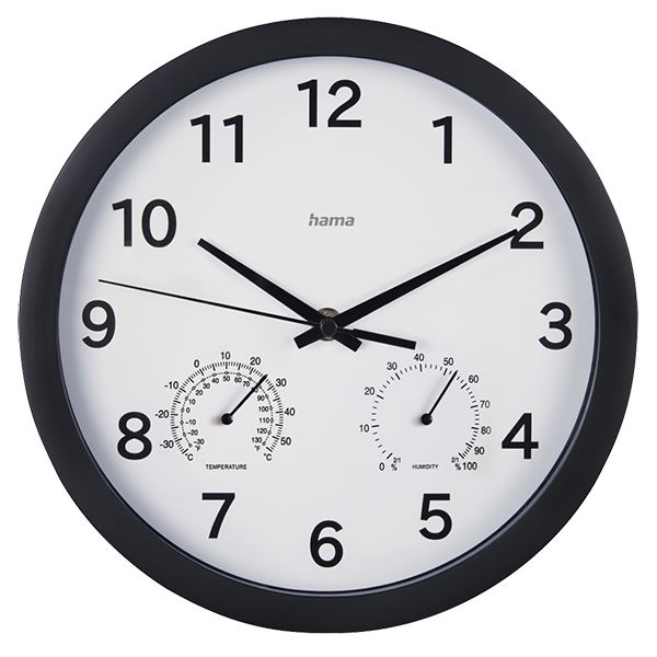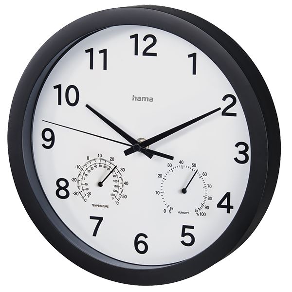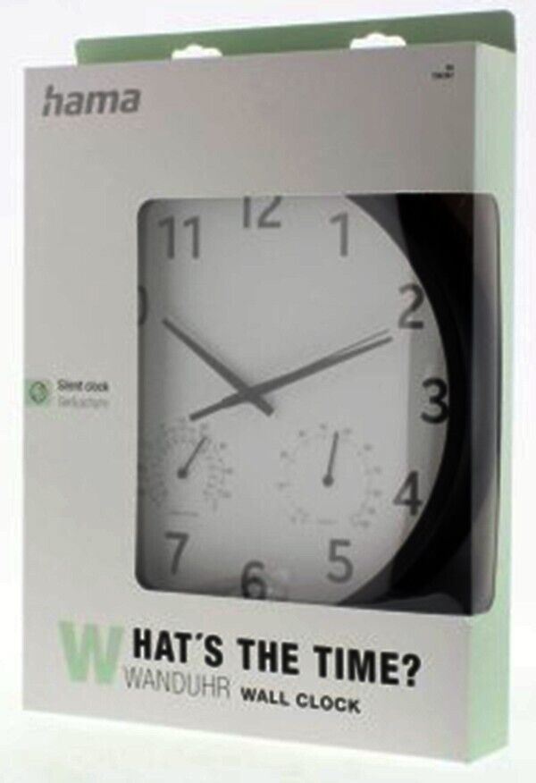 Hama Pure Plus Wall Clock 25cm with Thermometer Hygrometer Quiet #186342 Thermometer: What's in the Box Specification Colour Dial White Colour of the Housing Black Product Division Home & Living Seconds display Second Hand Additional Functions Hygrometer (0% to 100%), Thermometer (-30°C to +50°C) Cover material Glass Display Analogue Material Body Plastic Material Model Wall Clock Operating Mode Manual Special Feature Quiet Depth 4 cm Diameter 25 cm Weight 420 g Battery Type AA Mignon Number of Batteries 1 Warranty 2 years legal warranty only