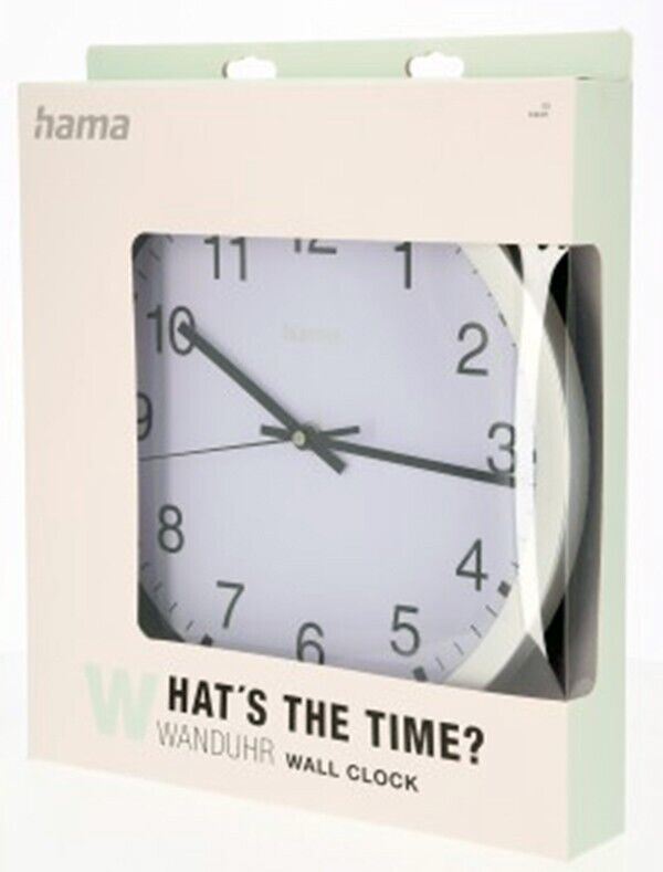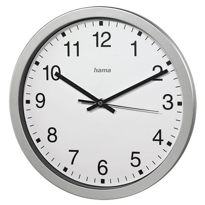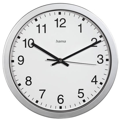Hama Wall Clock Analogue Quartz Aluminium Frame white face #186411 What's in the Box ? Specification Colour Dial White Colour of the Housing Silver Product Division Home & Living Seconds display Second Hand Cover material Glass Display Analogue Material Body Plastic Material Model Wall Clock Operating Mode Manual Depth 4 cm Diameter 30 cm Weight 585 g Battery Type AA Mignon Number of Batteries 1 Warranty 2 years legal warranty only