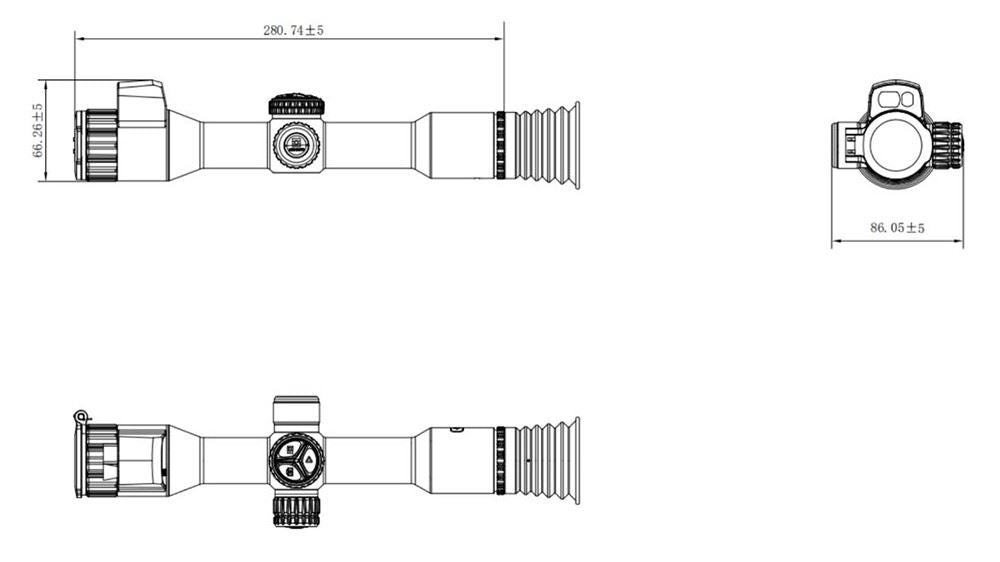 - Dimensions: 280.7 mm × 86.1 mm × 66.3 mm (without eyepiece)