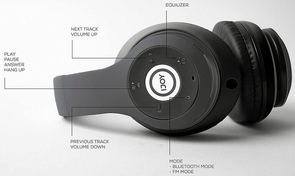 - Intuitive Button Controls: Control your audio experience with ease. The headphones come equipped with convenient button controls, allowing you to play/pause, adjust volume or track, switch between modes (Bluetooth to FM), and even customize your sound using the equalizer button.