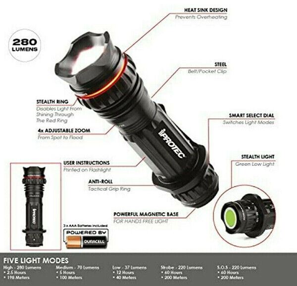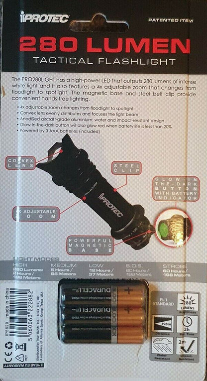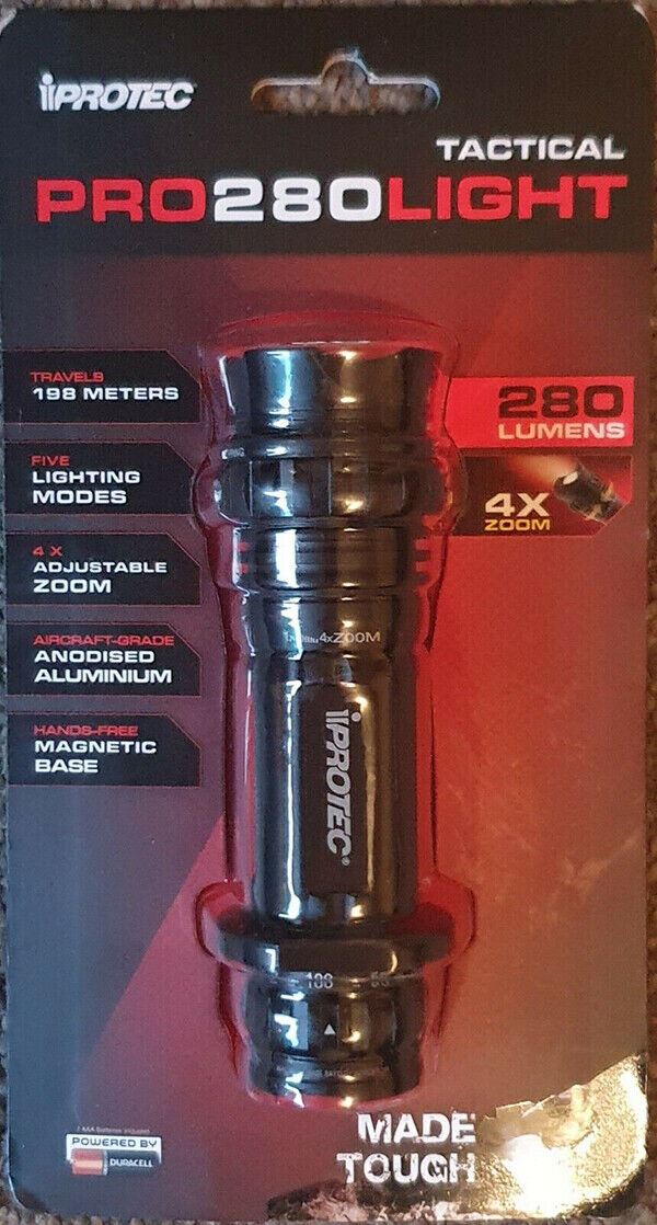 iProtec Pro 280 Lumen Tactical Flashlight Torch 4x Zoom #IP5620 (UK Stock) BNIP