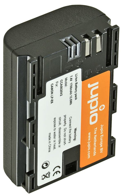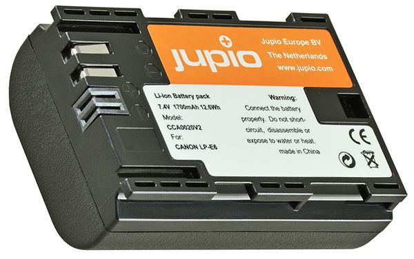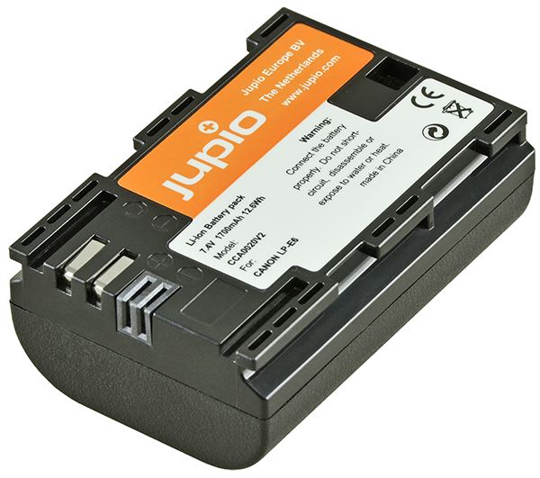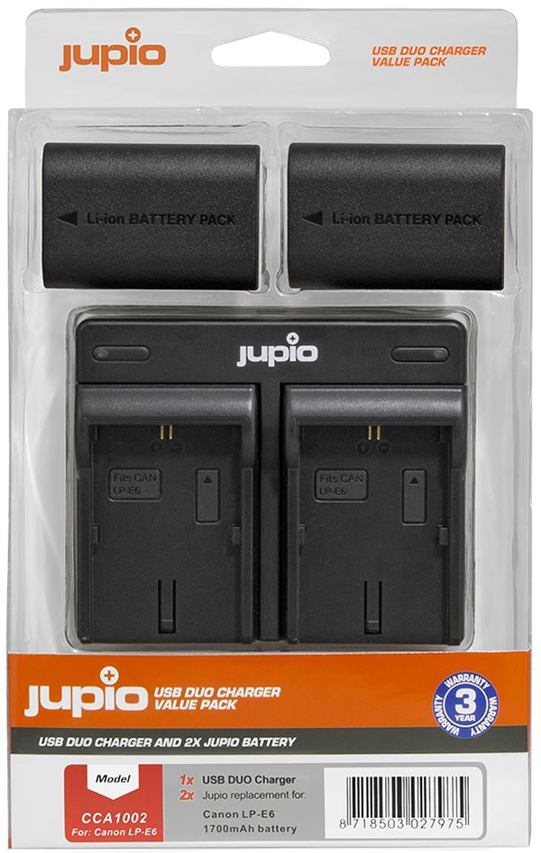Jupio Two LP-E6 Batteries + USB Dual Charger Value Pack (1700mAh) This compact and convenient LP-E6 Battery & USB Dual Charger Value Pack from Jupio combines two LP-E6 lithium-ion batteries with a USB-powered battery charger, making it possible to recharge the batteries from USB chargers and powerbanks at home or on the road. · Compatible with select Canon products · USB Input: 5V / 2.1A · Charger Output Range: 4.2-8.7V / 500mA · LED Charge Status Indicator Fits Canon 5D IV, 6D II, 7D II, R, XC10 Replaces Canon LP-E6N Jupio LP-E6 is designed as a replacement for Canon LP-E6, LP-E6N and LP-E6NH, although the Canon LP-E6NH is 430mAh higher capacity than this battery, so will work, but is slightly lower capacity and may not offer all the communication features the new LP-E6NH offers Each battery has a 3-year limited warranty, protecting you whatever happens. What’s Included? Specification Chemistry Lithium-Ion Output Voltage 7.4 VDC Package Weight 0.81 lb Box Dimensions (LxWxH) 7.9 x 5.3 x 1.7" Battery Chemistry: Lithium ion , Newer type of rechargeable, giving best performance for a rechargeable. Voltage: 7.4 V Capacity: 1700 mAh Watt hours: 12.6 Wh Weight: 76 g Dimensions: 56 mm x 38 mm x 21 mm