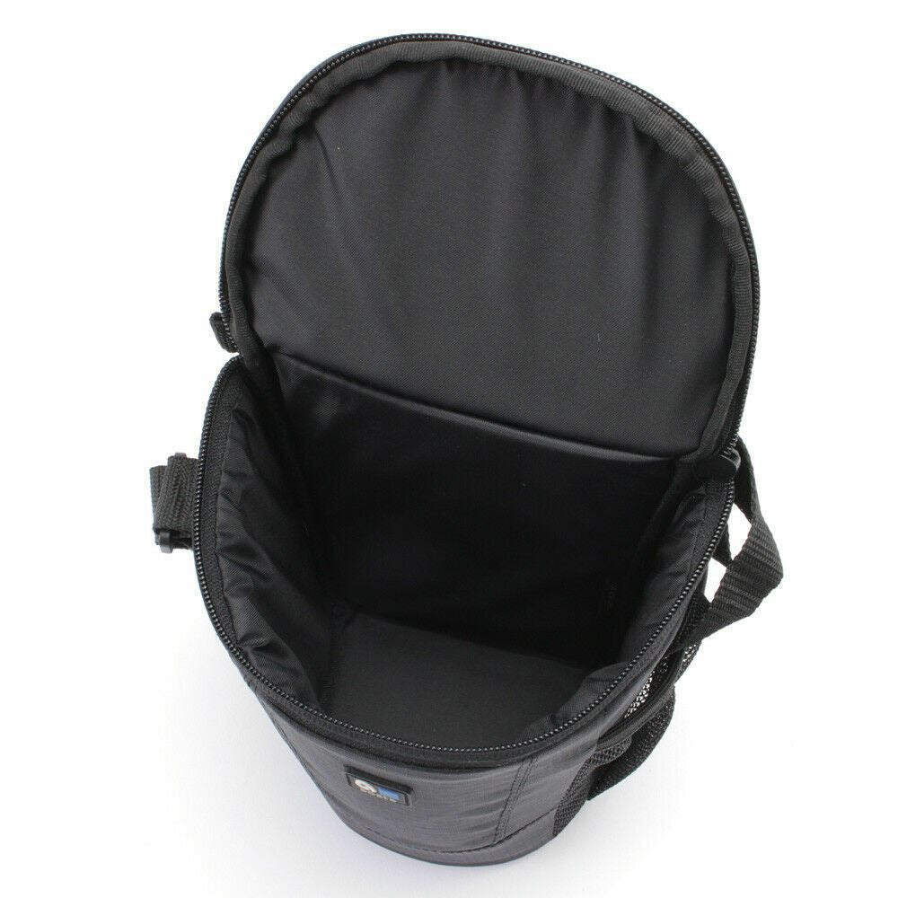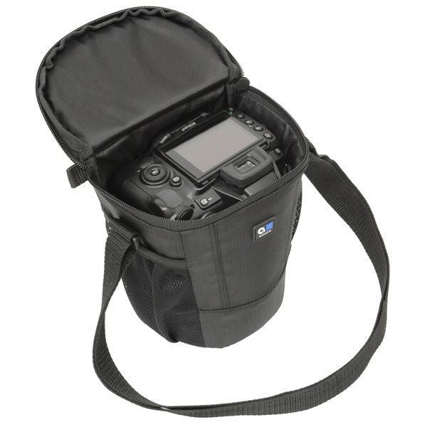 Top-loading zippered compartment houses DSLR camera with standard zoom lens attached
