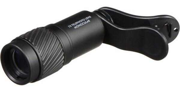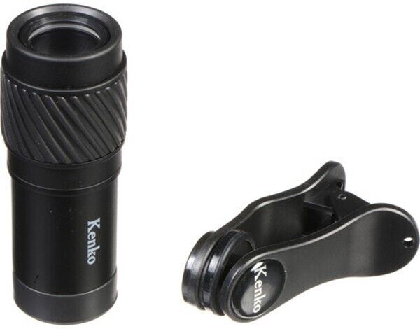 Kenko Real Pro 7x Telephoto Monocular and Lens for Smartphone Enhance your mobile photography with the Kenko Real Pro 7x Telephoto Lens and Monocular. This telephoto lens fits over your smartphone or tablet's camera and features three optical glass elements, with a multilayer coating, in three groups. The lens produces a 7.3° viewing angle making it suitable for close-up shots of faraway objects. The housing is made from aircraft-grade aluminum with an anodic oxidation finish and is equipped with a focus ring and a clip that's designed for attaching devices up to 1.2" thick. The clip has a swiveling silicone pad for attachment to uneven surfaces. When removed, an eyepiece can be fitted over the end for use as a monocular. A keychain is included. Compatibility Devices up to 1.2" thick Note: Maximum distance from edge to center of camera lens must not exceed 1". Protective cases may interfere with image quality. Lens may cover flash or microphone modules depending on device. Tripod recommended. What’s Included? Specification Angle of View 7° Maximum Magnification 7x Optical Design 3 Elements in 3 Groups Coating Multi-Layered Material of Construction Aluminum, Glass, Silicone Dimensions 1 x 3" / 25 x 75 mm Weight 1.8 oz / 51.03 g Package Weight 0.35 lb Box Dimensions (LxWxH) 7.9 x 4.6 x 1.6"