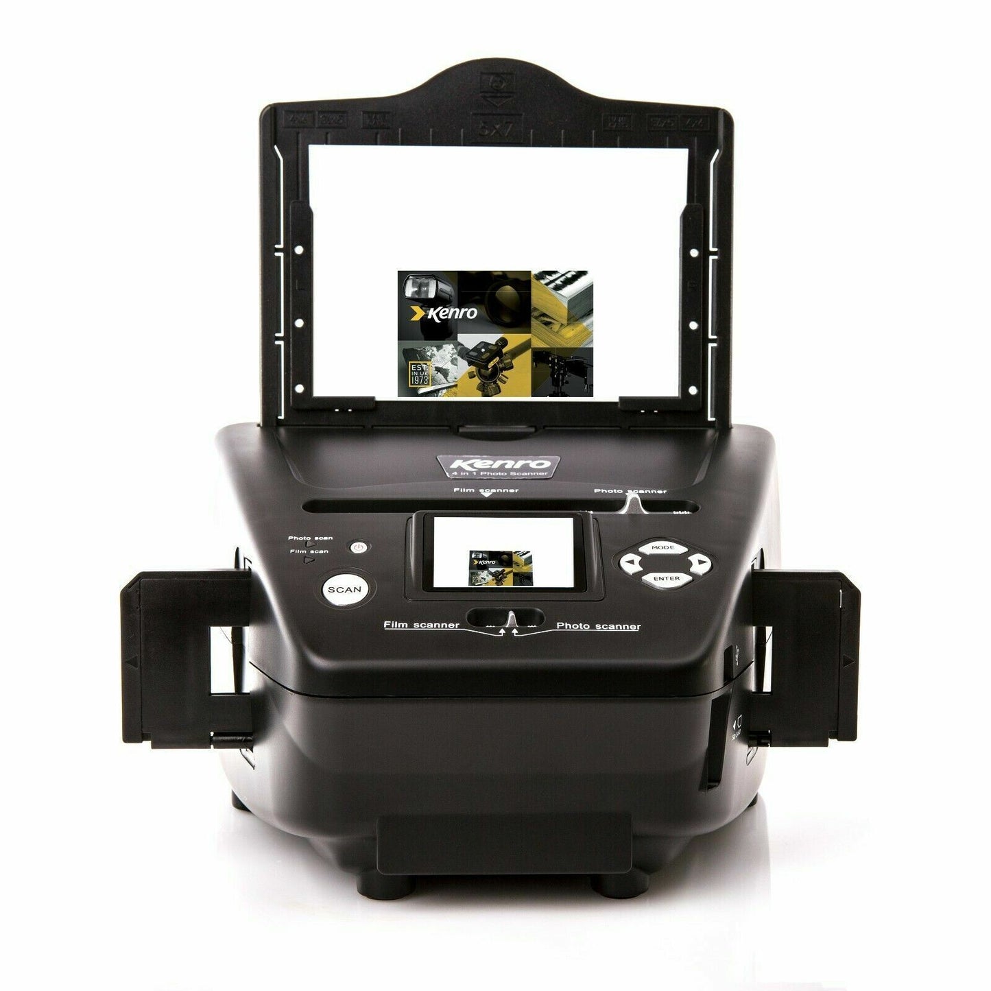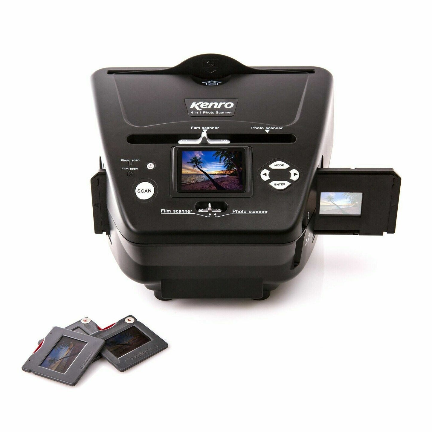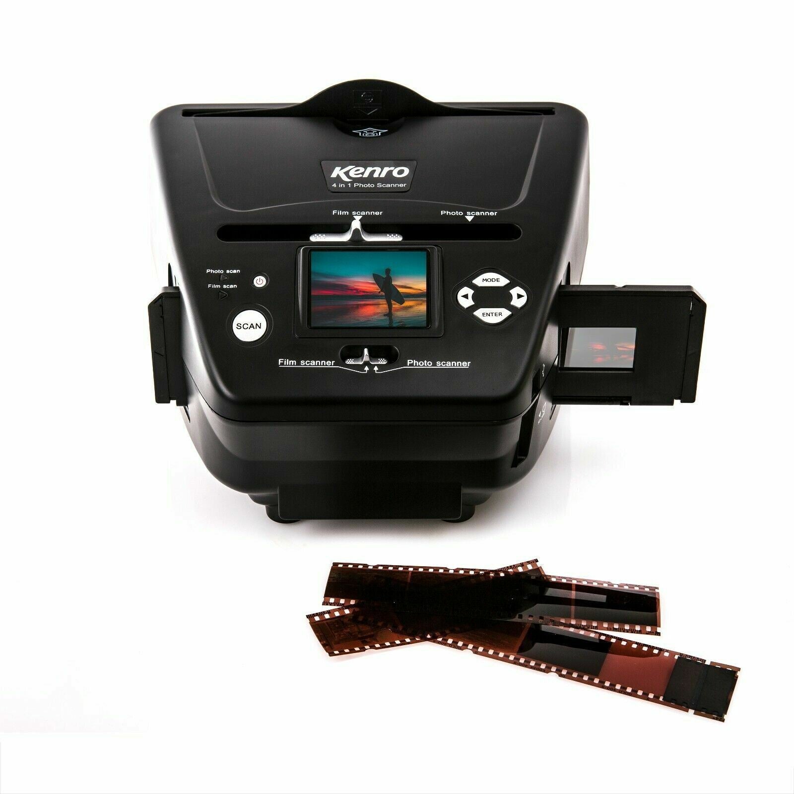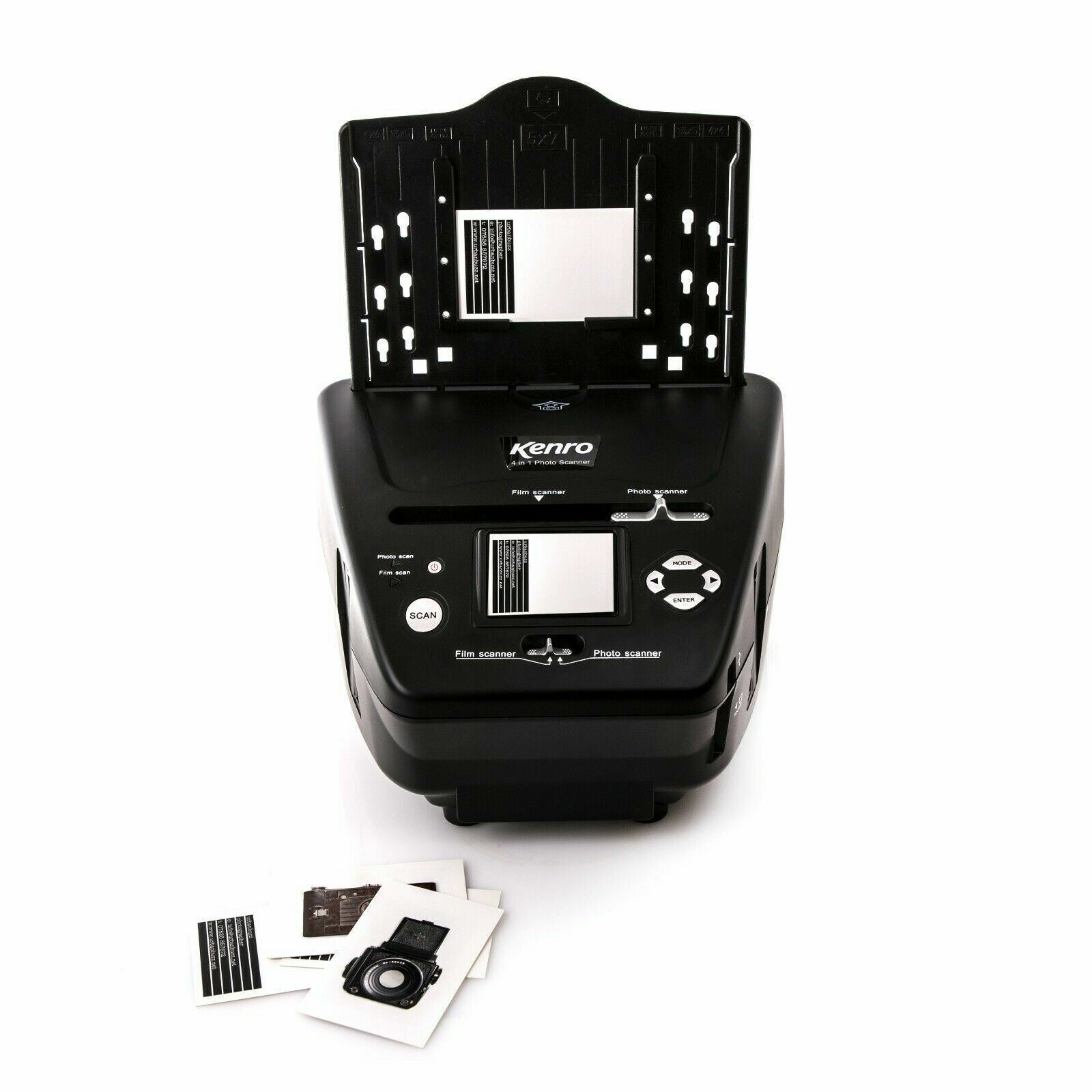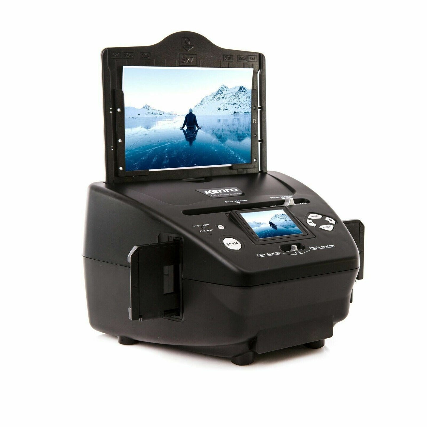 Scan film, slides, photos and business cards in one versatile unit. Supported formats include: photos 3.5x5”, 6x4” or 7x5”, standard business cards, 35mm negative or positive film strips, and 35mm slides.