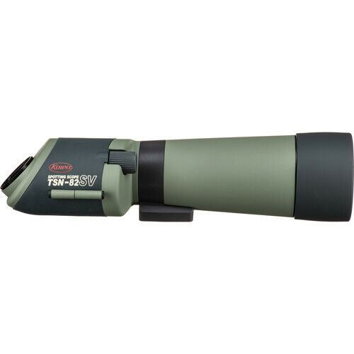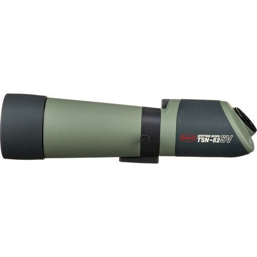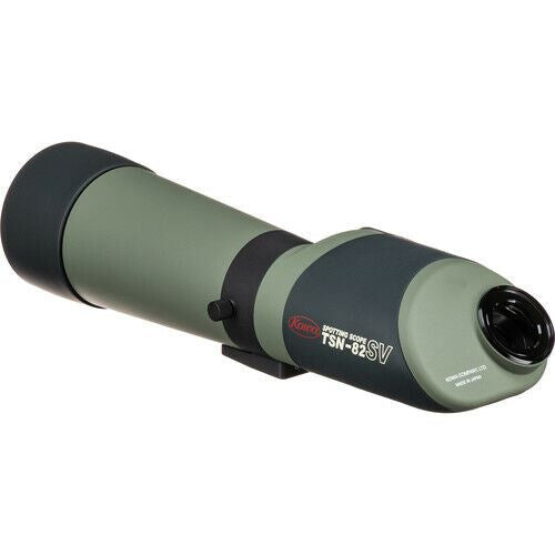Kowa TSN-82SV Angled Spotting Scope Body ONLY in Green Key Features Kowa enjoys a spectacular reputation of enduring quality internationally, where there are large numbers of nature enthusiasts. Their TSN-82SV Spotting Scope is the modern iteration of Kowa's TSN-821M scope, which endured for well over a decade as their premium design. The 82SV's a great choice if you want the very best in optics from a respected Japanese company without forking over an arm and a leg to get it. The TSN-82SV was created using advanced optical technology and the best of materials known. Its 82mm objective lens gathers lots of light, ensuring a bright field of view in nearly any practical nature viewing. It also makes for a great casual-use astronomical scope. The 82SV is offered exclusively as an angled viewing design. While it isn't a matter entirely settled until you experience the differences for yourself, it is nearly a universal belief that the angled scopes offer a more comfortable time of longer glassing, and are unequivocally easier to share among a group of observers. You can also get away with a shorter tripod using the angled scope, perhaps shaving precious ounces off your pack weight. Angled scopes do require a bit more experience at locating the subject; if you're tall and equipped with a tall tripod and primarily viewing alone, a straight viewing scope is often preferred. Large >3" objective lens gathers plenty of light Full multi-coatings upon all lenses and prisms Main lens composed from environmentally friendly, lead-free "eco-glass" Unique flat, wide Porro prism design 360° rotating base with click stops allows usage from all angles, eases comfort when viewing from elevated positions, and facilitates Wimberley Sidekick or other compact gimbal heads Quick-aiming finder on the scope's right aids in object locating Sliding sunshade protects objective from impact, rain, and stray light Accepts 86mm filters O-ring sealed and nitrogen purged Extensively adaptable to SLR, point & shoot, and video cameras via optional dedicated adapters Metal alloy and carbon fiber rubber-armored construction Kowa's attractive signature green finish will not disturb wildlife Equipped with both 1/4"-20 & 3/8"-16 tripod threads What’s Included? Specification Viewing Angle Angled Objective Lens Diameter 82 mm Minimum Focus Distance 19.7' / 6.0 m Fog-proof Yes Water Resistance Waterproof Dimensions L: 15.1" / L: 383.0 mm Weight 3.3 lb / 1480.0 g Package Weight 4.67 lb Box Dimensions (LxWxH) 17.45 x 6.7 x 6.15"