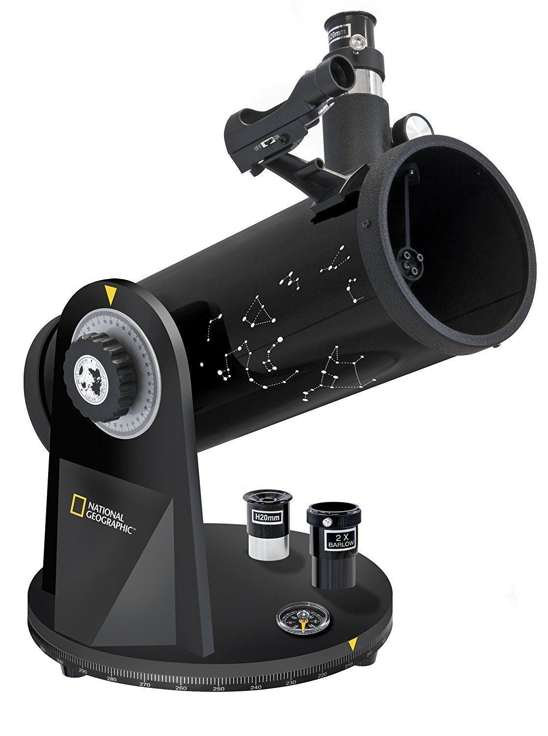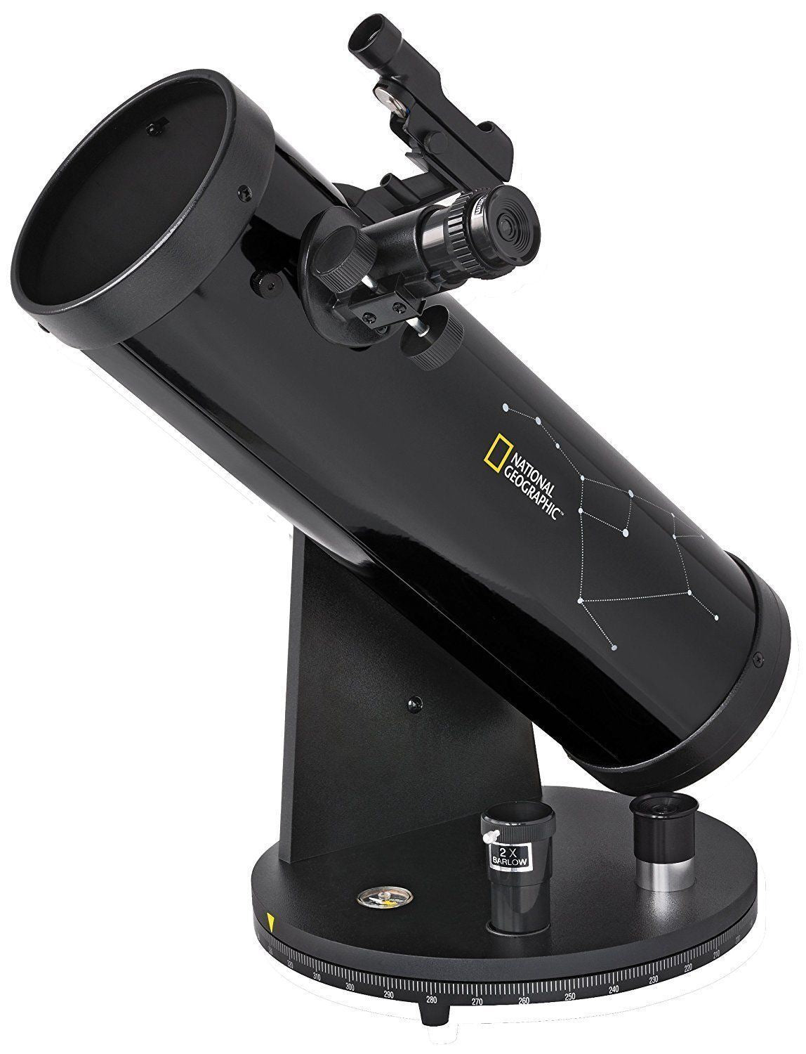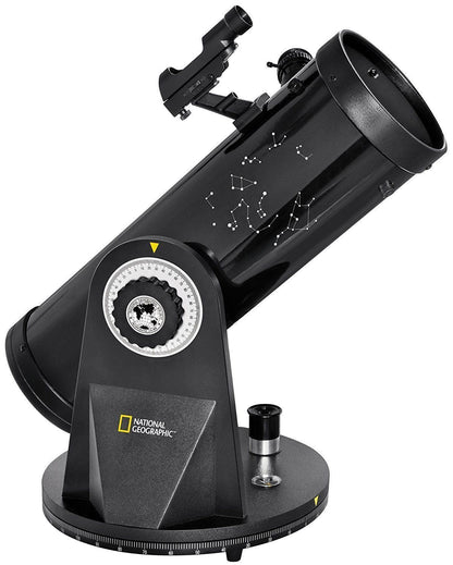 This is the larger of the two National Geographic Dobsonian telescopes - its 114mm / 4.5-inch mirror collects 3 times the light of the smaller 76mm / 3-inch Dobsonian, allowing it to see fainter objects and resolve more detail.
