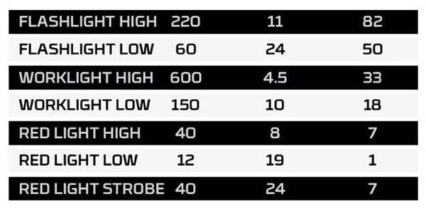 - Red Strobe (40 lumens): 40 hours / 7 meters